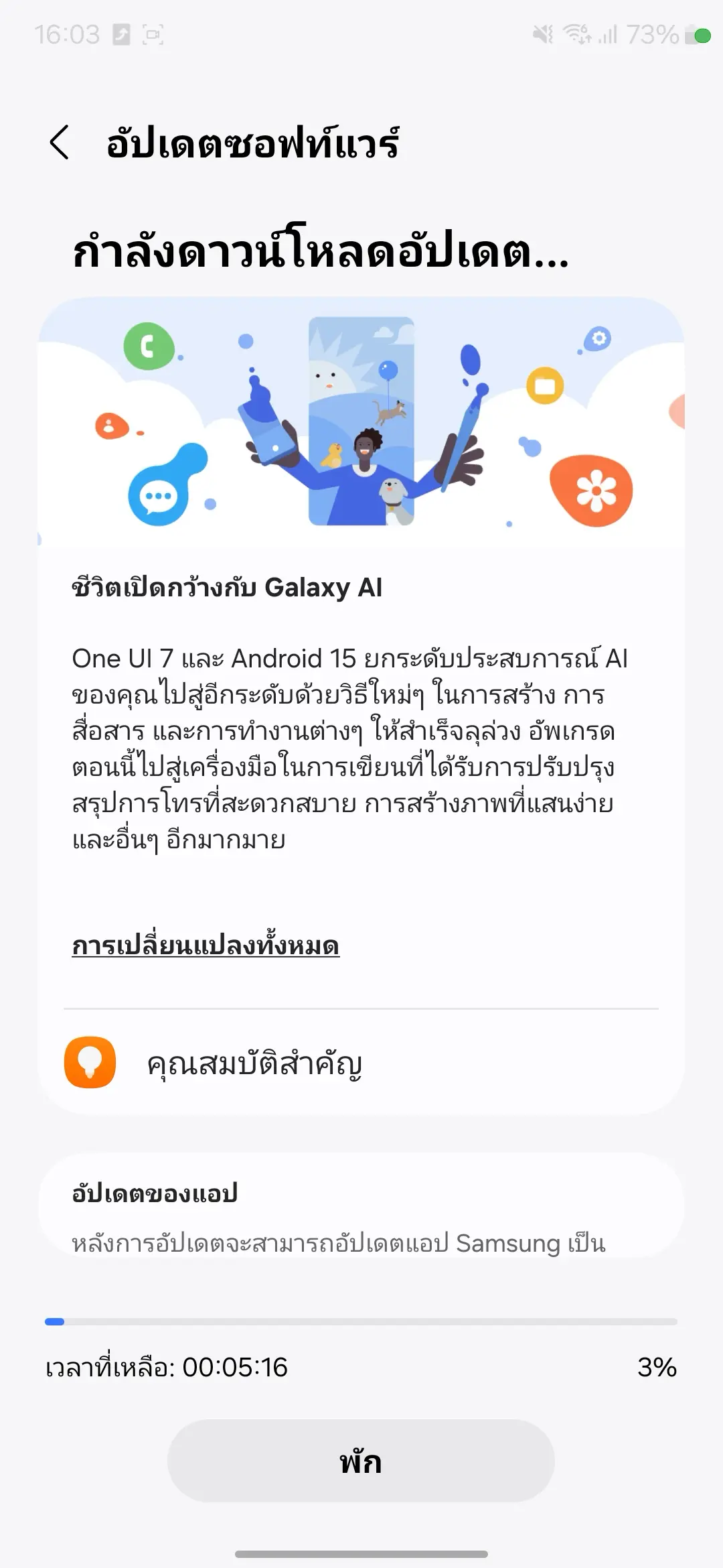 ในช่วงบ่ายของวันนี้ Galaxy Z Fold6 และ Galaxy Z Flip6 ได้รับการแจ้งเตือนอัปเดตซอร์ฟแวร์ One Ui 7 (Android 15) ถือเป็นสมาร์ตโฟนกลุ่มแรกในไทยที่ได้รับการอัปเดต หลังจากนั้นไม่กี่ชั่วโมง Galaxy S24 Series ก็ได้รับการแจ้งเตือนอัปเดตตามมา
