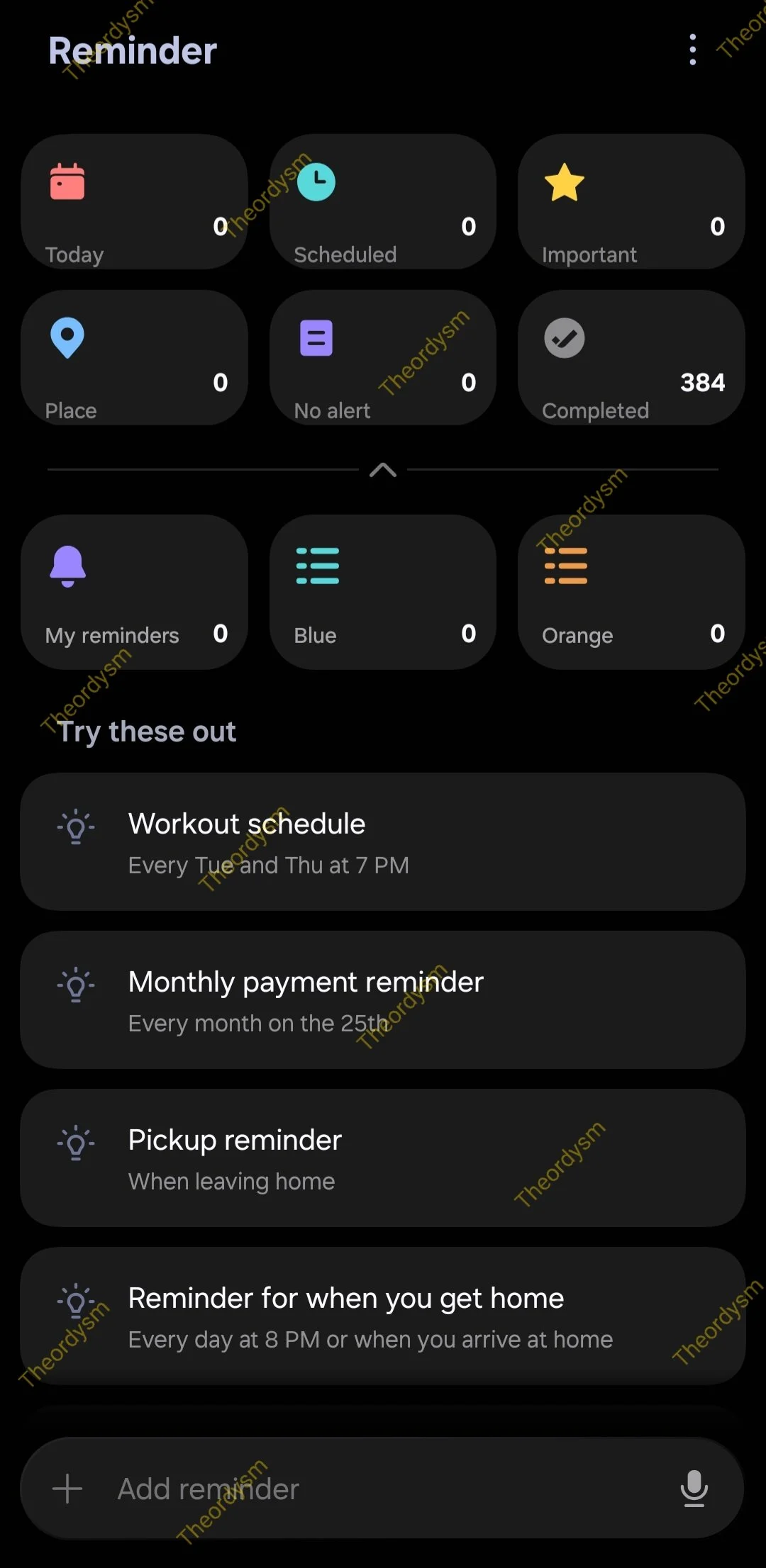 บนหน้าจอหลักของแอป Samsung Reminder ดีไซน์ใหม่จะมีการแสดง การ์ดหมวดหมู่ (Category cards) จำนวน 6 รายการ อยู่ด้านบน ได้แก่ Today, Scheduled, Important, Place, No Alert และ Completed