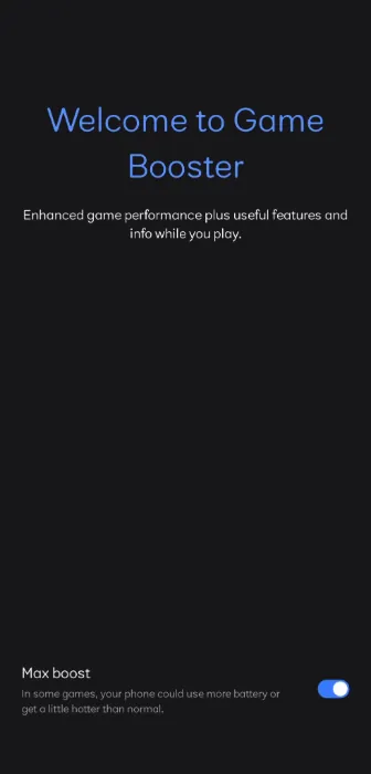 ถ้าได้อัปเดตแอป Game Booster แล้ว ฟีเจอร์ใหม่อย่างแรกที่คุณจะเห็นเมื่อเปิดแอปคือ “Max Boost” ซึ่งจะแสดงเป็นสวิตช์ให้เปิด-ปิดที่ด้านล่างของหน้าต้อนรับ แอปไม่ได้อธิบายอย่างชัดเจนว่าฟีเจอร์นี้ทำอะไร แต่มีข้อความเตือนว่า “ในบางเกม โทรศัพท์ของคุณอาจใช้แบตเตอรี่มากขึ้นหรือร้อนขึ้นกว่าปกติ” ซึ่งน่าจะหมายความว่าเมื่อเปิดฟีเจอร์นี้ การตั้งค่าของโทรศัพท์จะถูกปรับให้เน้นที่ประสิทธิภาพสูงสุดเพื่อเล่นเกมได้เต็มที่