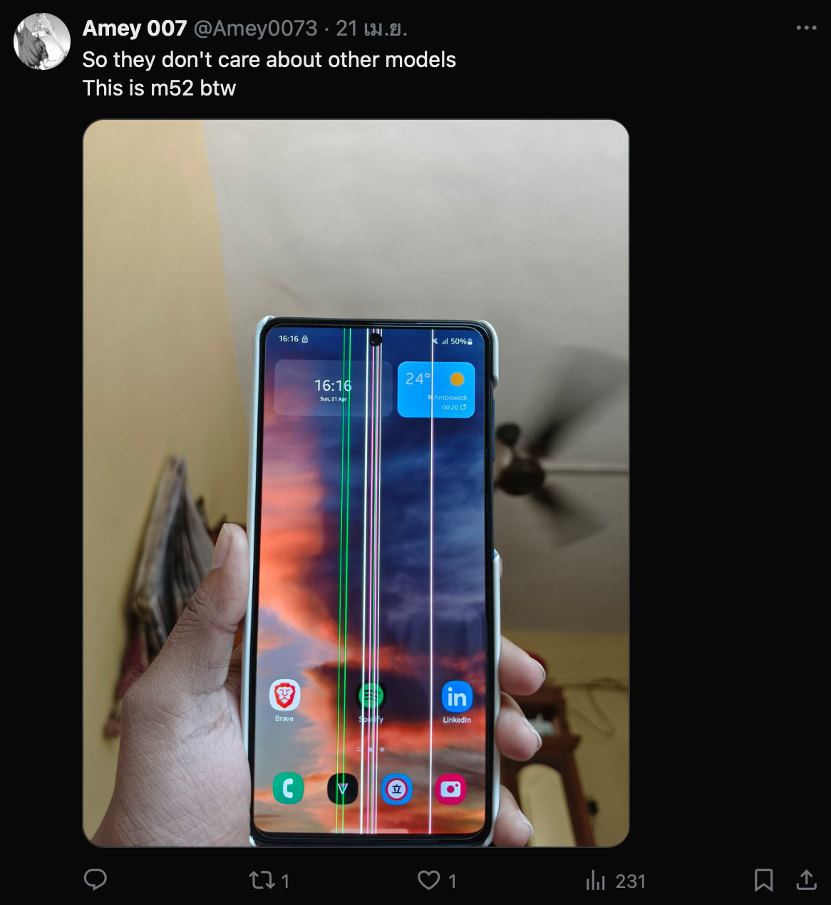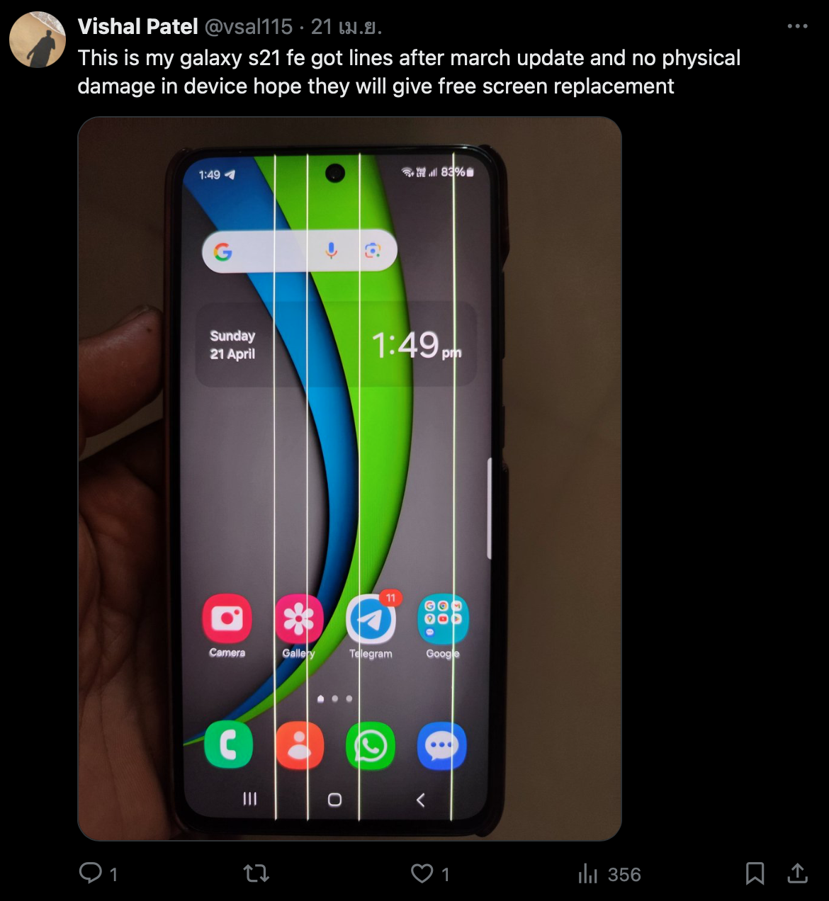 มีรายงานว่าผู้ใช้สมาร์ตโฟน Samsung เจอปัญหาจอเป็นเส้นเขียว หลังอัปเดต Patch เม.ย. 2024, บางรุ่นในอินเดียเอาเครื่องไปเปลี่ยนจอได้