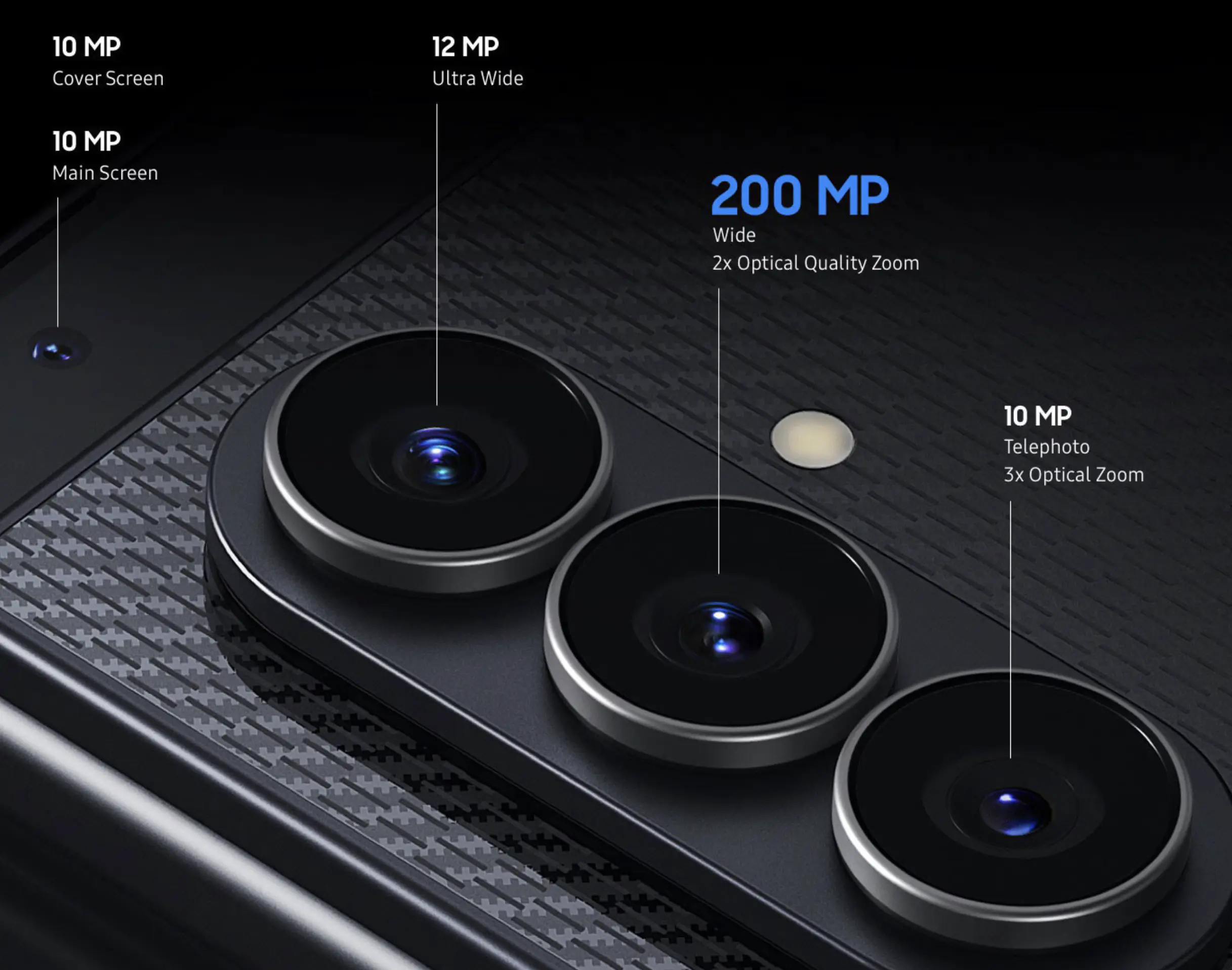 ด้านหลังเครื่องติดตั้งกล้อง 3 ตัว ประกอบด้วยกล้อง Wide 200MP, กล้อง Ultra-Wide 12MP และกล้อง Telephoto 10MP พร้อมซูมออปติคัล 3 เท่า อีกทั้งยังมีกล้อง Selfie 10MP ทั้งบนหน้าจอหลัก และหน้าจอด้านนอก