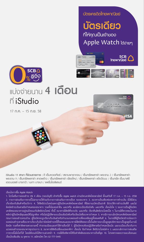 บัตรเครดิตไทยพาณิชย์สามารถใช้ผ่อน 0% นาน 4 เดือน (รอบบัญชี) เริ่มตั้งแต่วันที่ 17 ก.ค. – 15 ก.ย. 2558 สำหรับ iStudio 11 สาขาที่ร่วมรายการ (ตามภาพด้านบน) ซึ่งก็เป็นตัวเลือกที่คุ้มที่สุดในตอนนี้แล้วครับ ^^