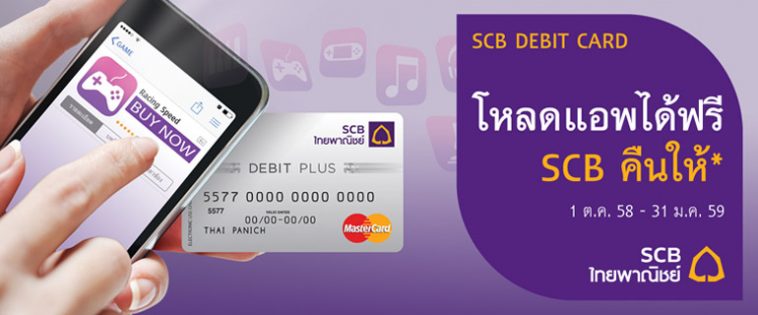 สำหรับลูกค้าบัตรเดบิต SCB เมื่อซื้อแอปพลิเคชัน (รวมถึงไอเท็มในเกมและสติ๊กเกอร์) ผ่าน App Store หรือ Google Play จะมีการคืนเงินให้สูงสุดเดือนละ 60 บาท/บัตร/เดือน โดยลูกค้าจำเป็นต้องลงทะเบียนเพื่อรับสิทธิทุกเดือน ซึ่งทำได้โดยการส่ง SMS คำว่า FREE วรรค ตามด้วยเลขบัตรเดบิต 12 หลักสุดท้าย ไปที่เบอร์ 4545333
