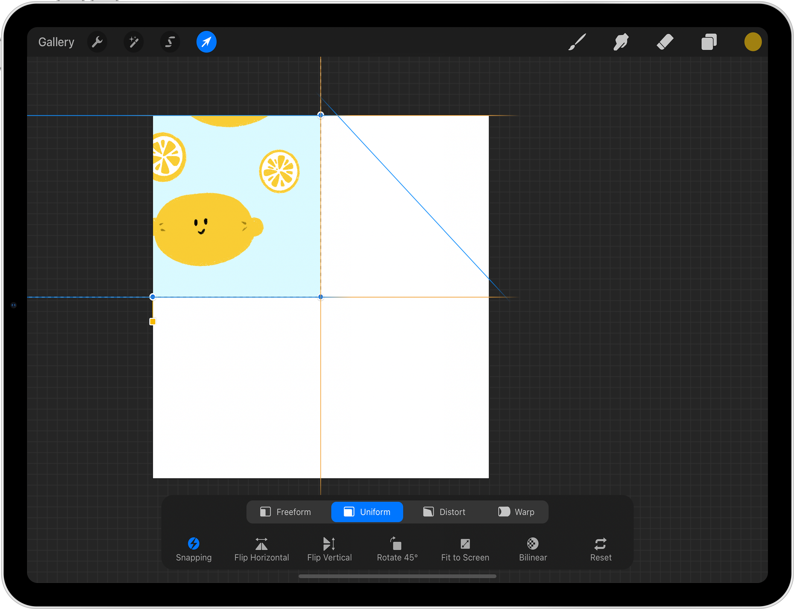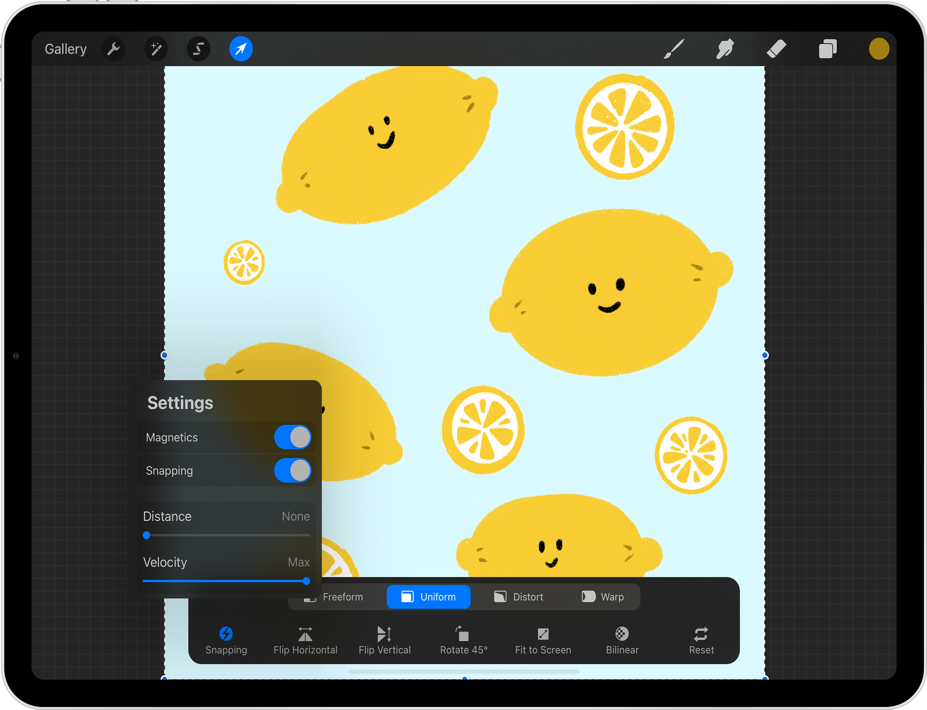ต่อจากนั้นไปที่เครื่องหมาย ลูกศรมุมซ้ายบน กดไปที่ Uniform > Snapping > เปิด Magnetics และ Snapping เพื่อให้ภาพเลื่อนแบบ snap ไปกับจุด