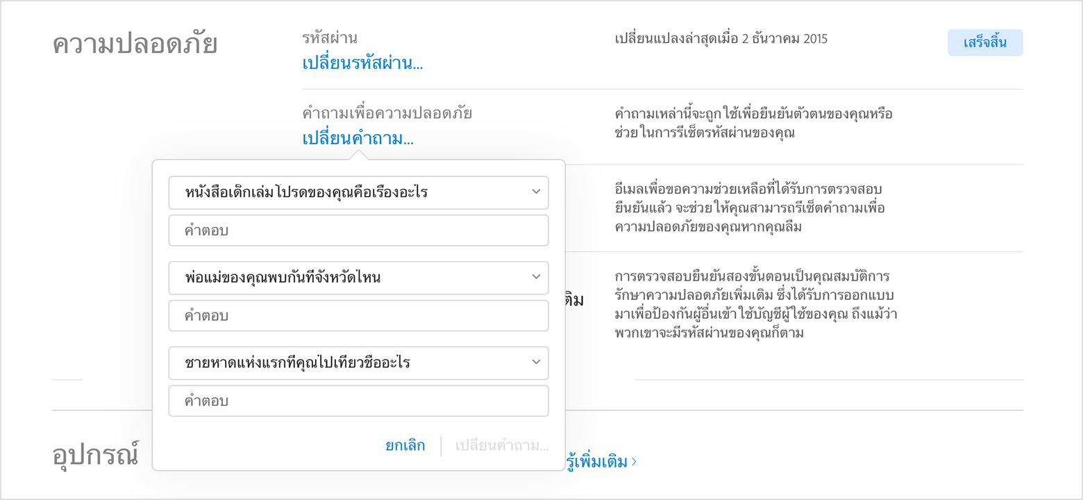 อย่าให้รหัสผ่าน คำถามเพื่อความปลอดภัย รหัสยืนยันตัวตน คีย์การกู้คืน หรือรายละเอียดด้านความปลอดภัยของบัญชีอื่นๆ กับคนอื่น และ Apple จะไม่ขอข้อมูลนี้จากผู้ใช้โดยเด็ดขาด