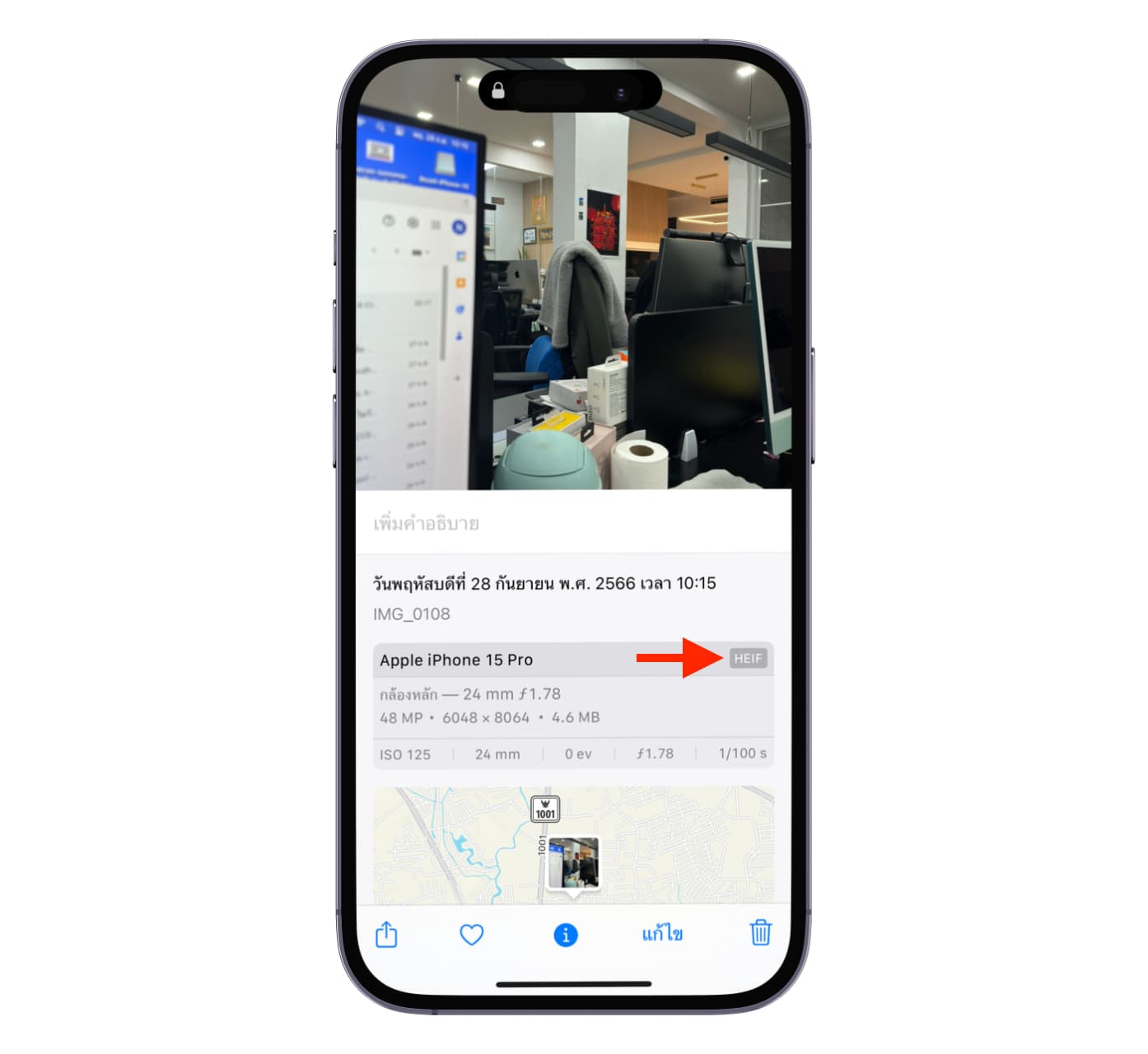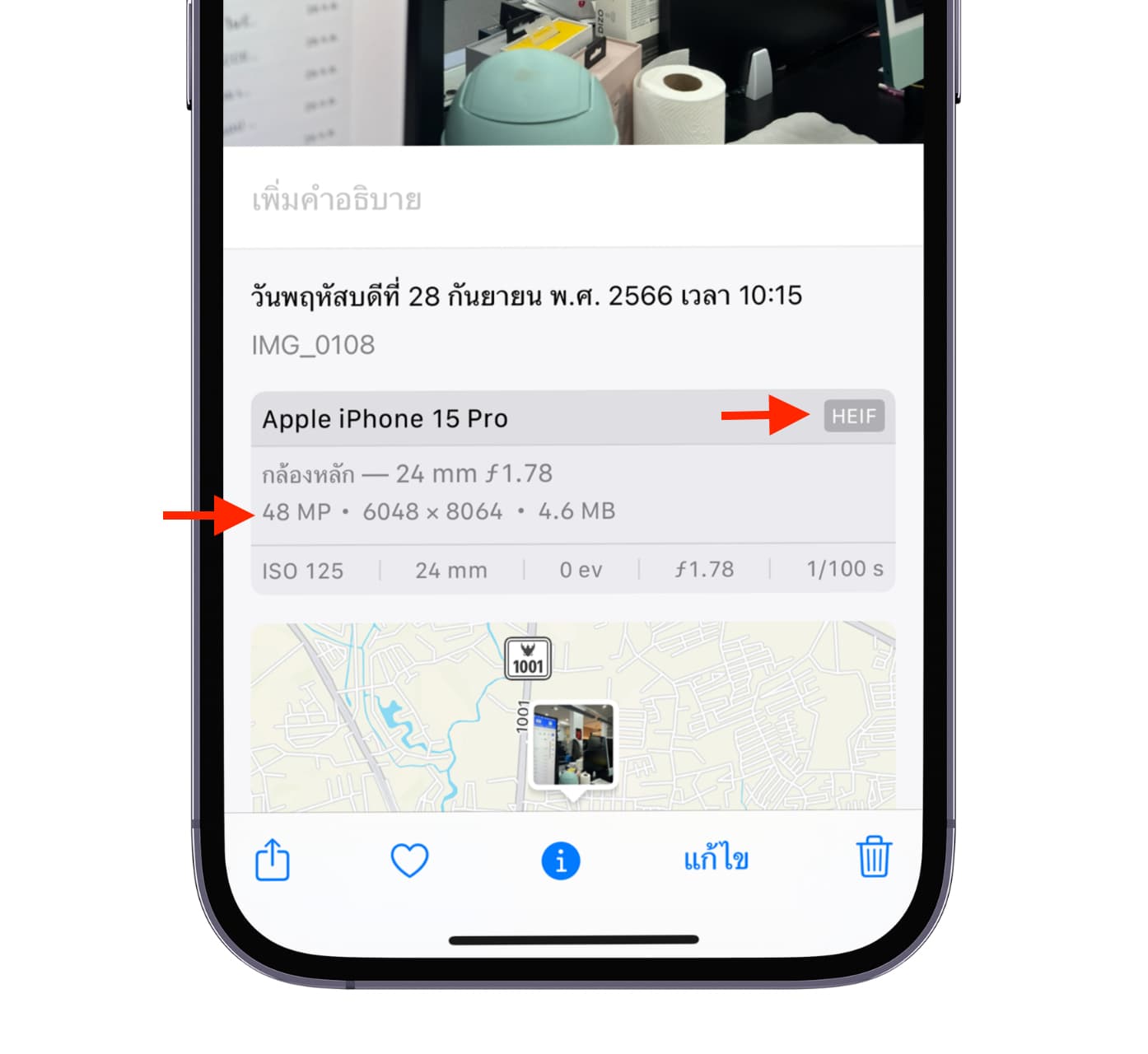 เมื่อกดถ่ายด้วยกล้องเลนส์ไวด์ เราจะได้คุณภาพไฟล์แบบ HEIF ความละเอียด 48MP