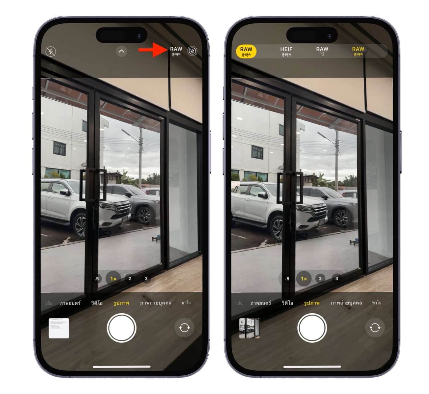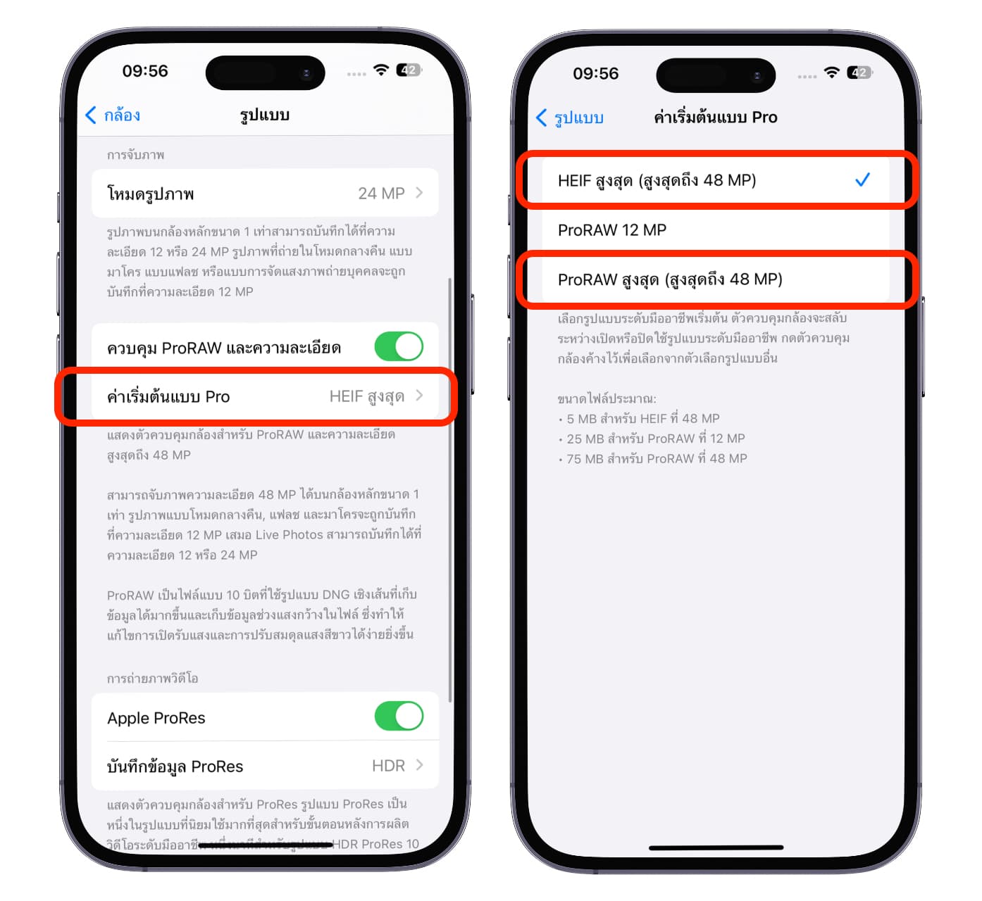 ค่าเร่ิมต้นแบบ Pro > เลือกเป็น HEIF สูงสุด หรือจะเลือกเป็น ProRAW สูงสุดก็ได้