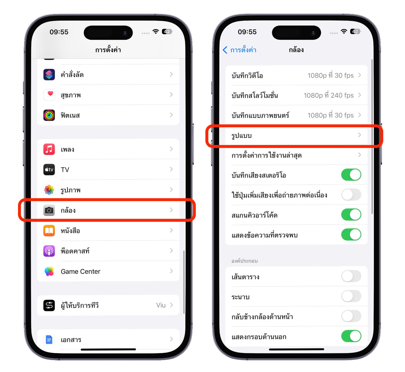 เข้าไปที่ แอปการตั้งค่า > กล้อง > รูปแบบ