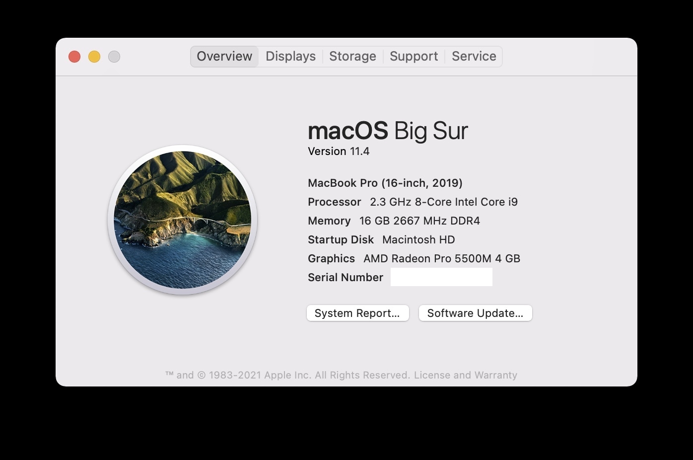 ในบทความนี้เครื่อง MacBook Pro 16″ ปี 2019 ของผมอัปเดตเป็น macOS 11.4
