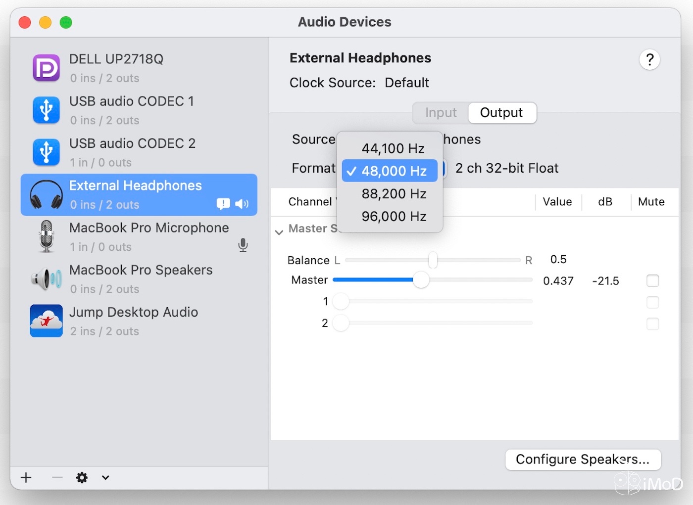 ในภาพนี้ผมเชื่อมต่อสาย 3.5 มม. ที่ต่อเข้ายังลำโพงภายใน โดย Mac จะบอกว่าเราเชื่อมต่อกับอะไรอยู่ ทั้งนี้สามารถเลือกปรับ Format ได้เลย ซึ่งค่า Sample Rate ค่าปกติตั้งไว้ที่ 44,100 Hz หรือ (44.1 kHz) ซึ่งเป็นค่ามาตรฐานของการทำงานด้านเสียงทั่วไป