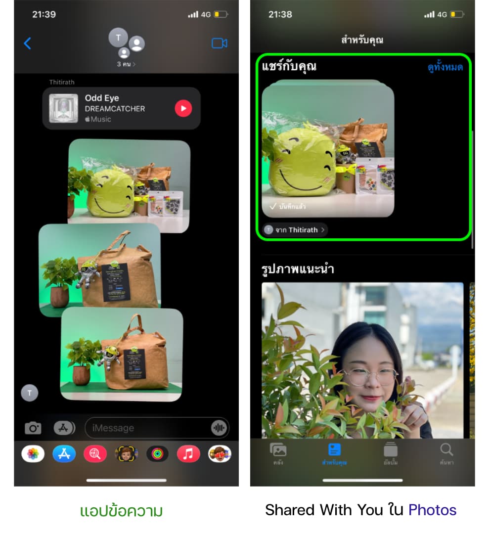 หากเราบันทึกรูปภาพจากแอปข้อความมาไว้ในเครื่อง ที่แท็บ “สำหรับคุณ” (For You) ในแอปรูปภาพ จะแสดงส่วนที่ชื่อว่า “แชร์กับคุณ” และจะขึ้นว่าแชร์อยู่กับใคร โดยหากมีการแชร์รูปภาพจากหลาย ๆ คน ก็จะมีการแยกอัลบั้มเป็นของแต่ละคนไป