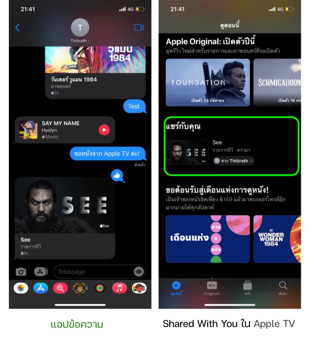 ในแอป Apple TV ก็แสดงคอนเท้นต์ที่เราเคยแชร์ที่แท็บ “ดูตอนนี้” (Watch Now) ด้วยเช่นกัน