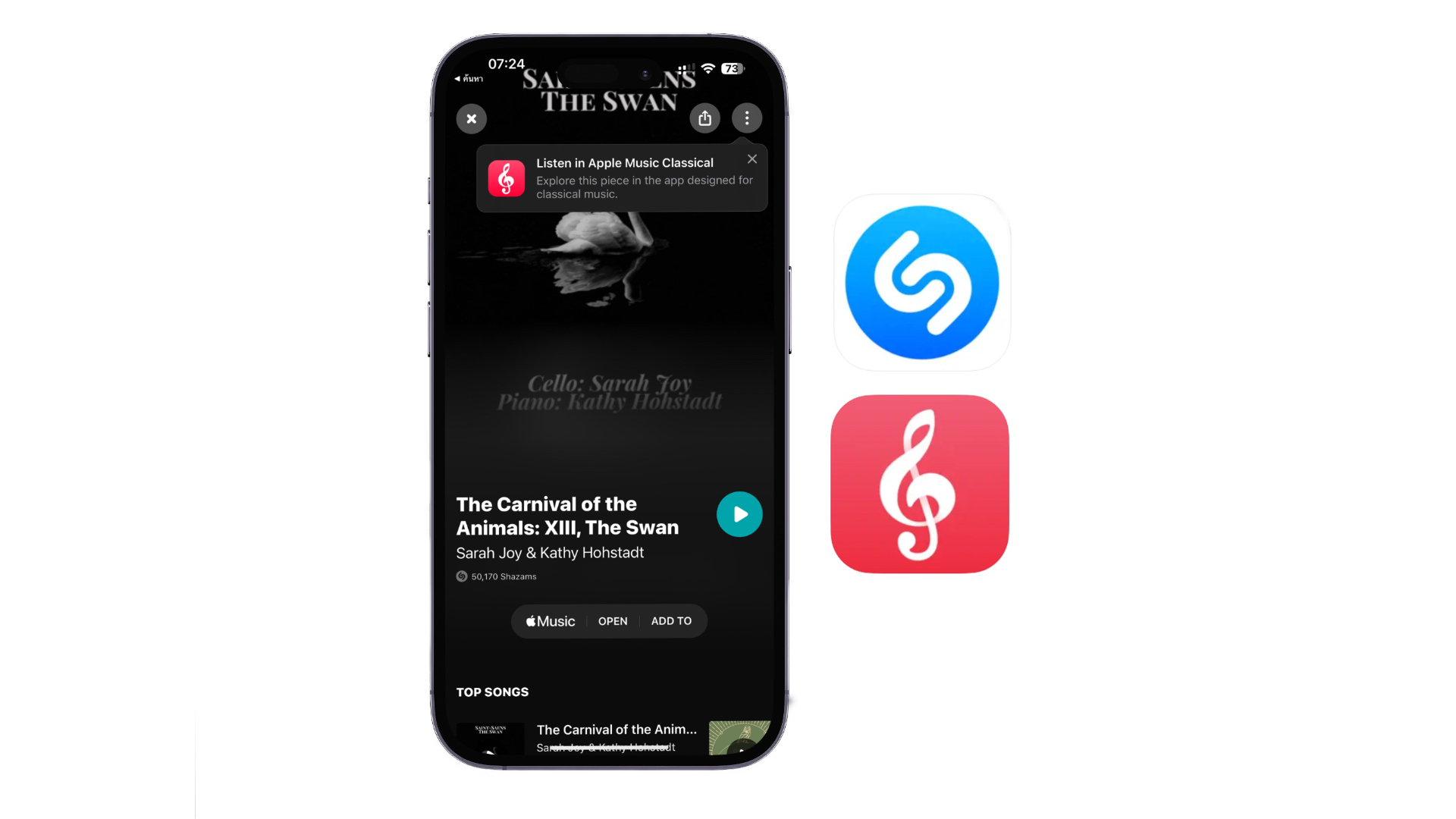เมื่อเปิดแอป Shazam แล้วฟังเสียงเพลงคลาสสิกจากลำโพงภายนอก ระบบจะค้นหาชื่อเพลงให้ โดยผู้ใช้สามารถเลือกได้ว่าจะเปิดเพลงนี้ในแอป Apple Music Classical หรือแอป Apple Music