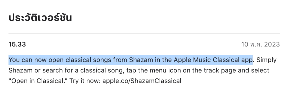 Shazam ได้ทำการอัปเดตเวอร์ชัน เป็น 15.33 เพื่อรองรับการค้นหาเพลงคลาสสิคเเละยังเปิดฟังในเเอป Apple Music Classical ได้งานนี้สายเพลงคลาสสิกไม่ควรพลาด!