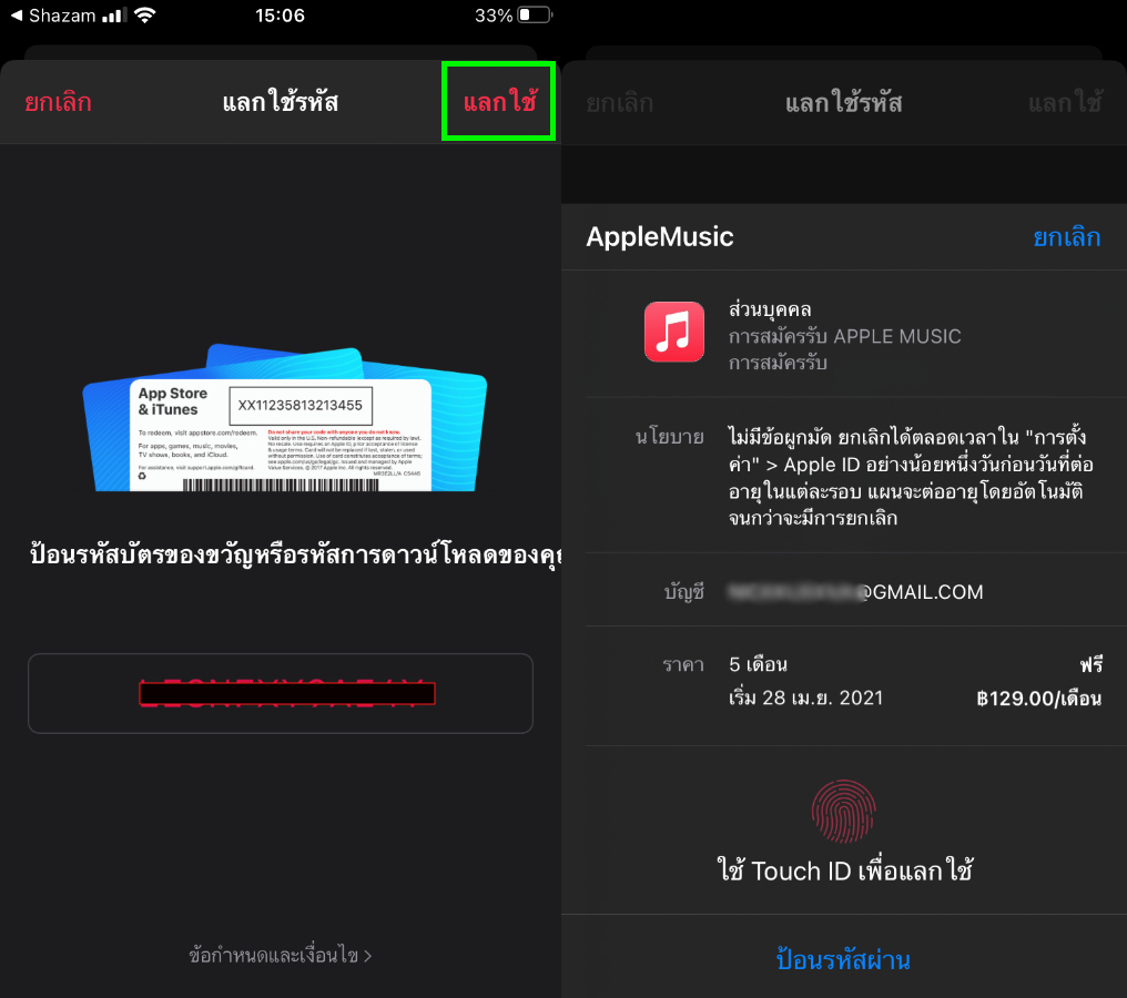 จากนั้นแอปจะพาเราเข้าไปที่ Apple Music และมีโค้ดเด้งขึ้นมา > แตะคำว่า “แลกใช้” ที่ด้านบน > จากนั้นจะมีการให้เราสแกน Touch ID เพื่อยืนยันการสมัคร