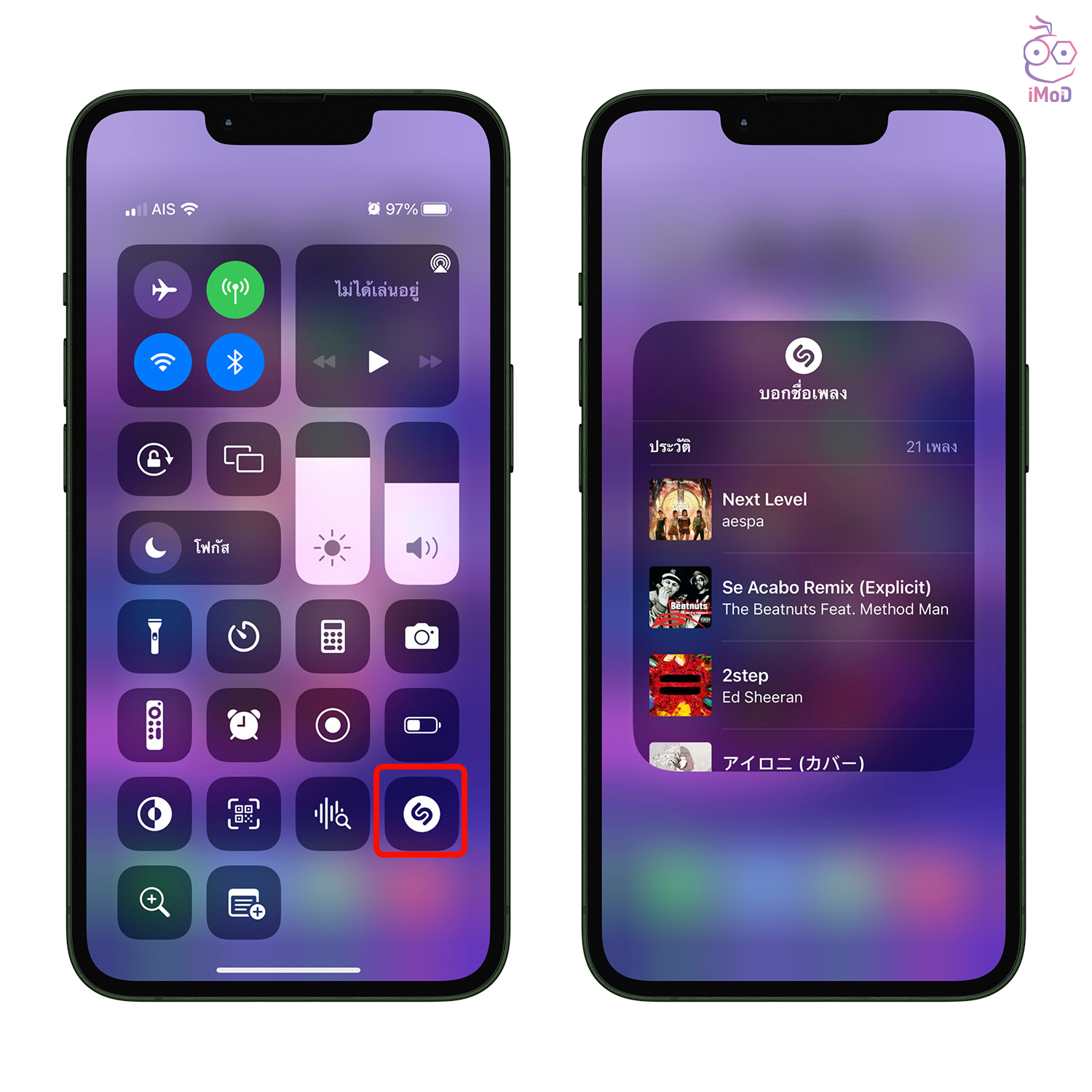 เพียงแค่แตะไอคอน “บอกชื่อเพลง” ที่เป็นรูปโลโก้ Shazam ในส่วน Control Center ค้างไว้ เราก็จะเห็นประวัติการค้นหาเพลงที่ผ่านมาทั้งหมดที่เคยค้นหาในอุปกรณ์ที่ลงชื่อเข้าใช้ Apple ID เดียวกัน ทำให้เราย้อนดูเพลงที่อยากทราบได้ง่ายมากขึ้น รวมถึงแสดงประวัติในแอป Shazam ด้วย
