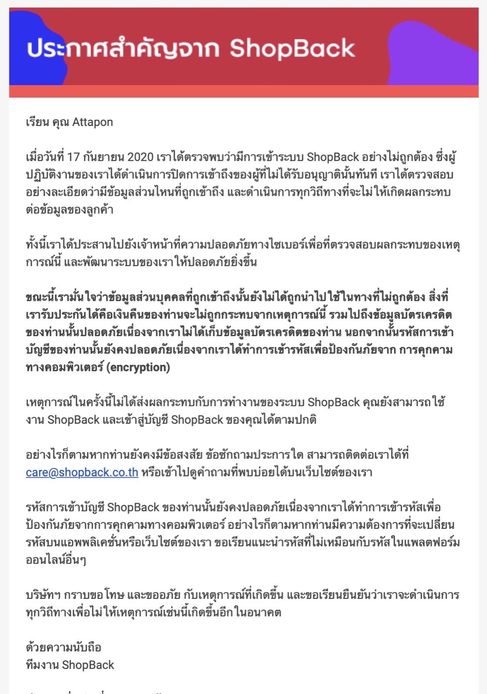 ShopBack ส่งอีเมลแจ้งให้ผู้ใช้ทราบกรณีตรวจพบการเข้าถึงของผู้ที่