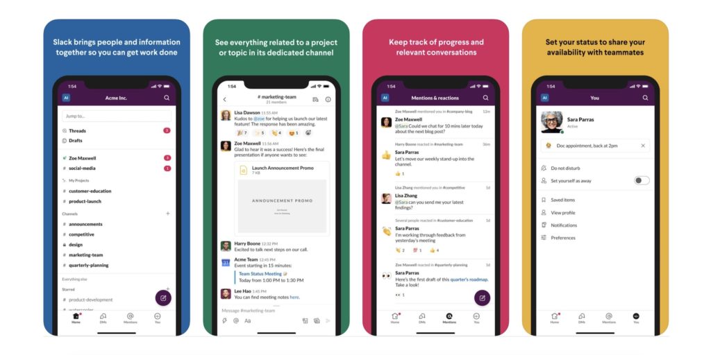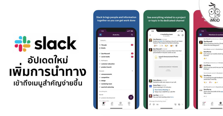 แอป Slack สำหรับ iPhone และ iPad ได้อัปเดตเปลี่ยนแปลงครั้งใหญ่ ย้ายเมนูที่เคยอยู่ในส่วนเมนูสามขีด มาไว้ในส่วนด้านล่างของหน้าจอ 4 เมนู ได้แก่ Home, DMs, Mentions และ You เพื่อให้ผู้ใช้เข้าถึงเมนูสำคัญได้ง่ายขึ้น