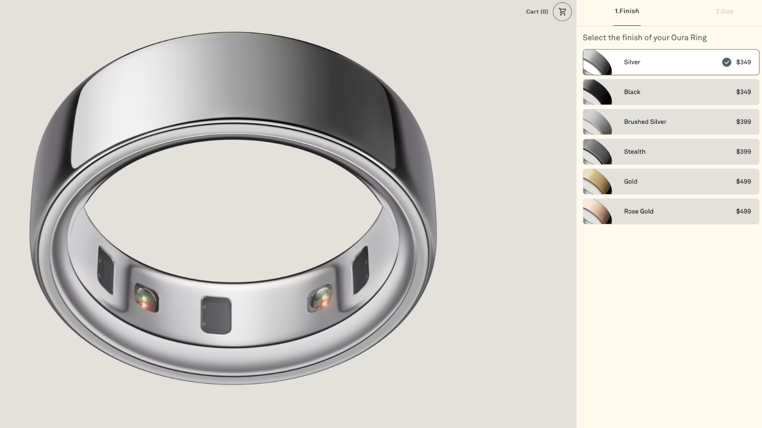 Oura Ring 4 ความกว้าง: 7.90 มม. ความบางเพียงแค่ 2.88 มม. และมีน้ำหนักระหว่าง 3.3 กรัม ถึง 5.2 กรัม ตามแต่ละไซส์ โดยไซส์จะมีให้เลือกตั้งแต่ 4 – 15 และสามารถดำน้ำได้ที่ความลึกสูงสุดไม่เกิน 100 เมตร เซ็นเซอร์ด้านในมีขนาด 0.3 มิลลิเมตร