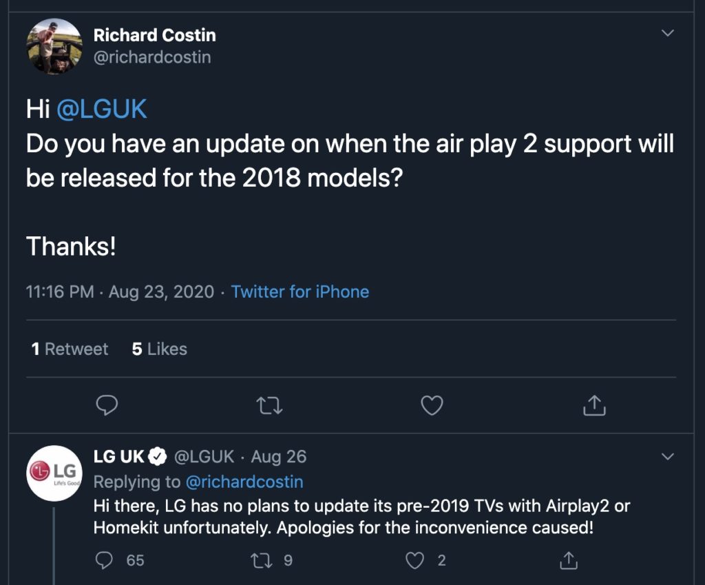 ก่อนหน้านี้ LG ได้ประกาศมีแผนจะอัปเดตสมาร์ตทีวีรุ่นปี 2018 ให้รองรับ AirPlay 2 และ HomeKit ของ Apple แต่ล่าสุดพบข้อมูลว่า LG อาจไม่อัปเดตรองรับฟีเจอร์เหล่านี้ในสมาร์ตทีวีปี 2018 แล้ว