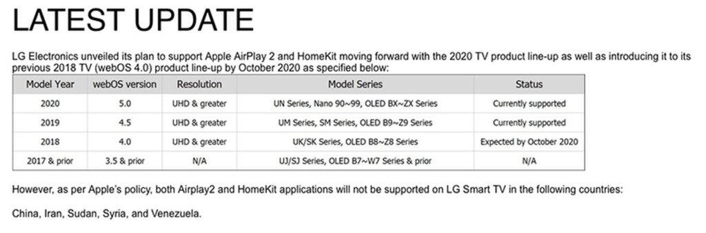 ตามรายงานระบุว่าพบเอกสารสนับสนุนของ LG ที่มีแผนจะเพิ่มการรองรับ AirPlay 2 และ HomeKit ให้กับสมาร์ตทีวี LG รุ่นปี 2018 บางรุ่นในเดือนตุลาคม 2020 ได้แก่ ทีวี LCD ซีรีส์ SK, UK และรุ่น OLED ซีรีส์ B8 ที่ใช้ชื่อ Z8
