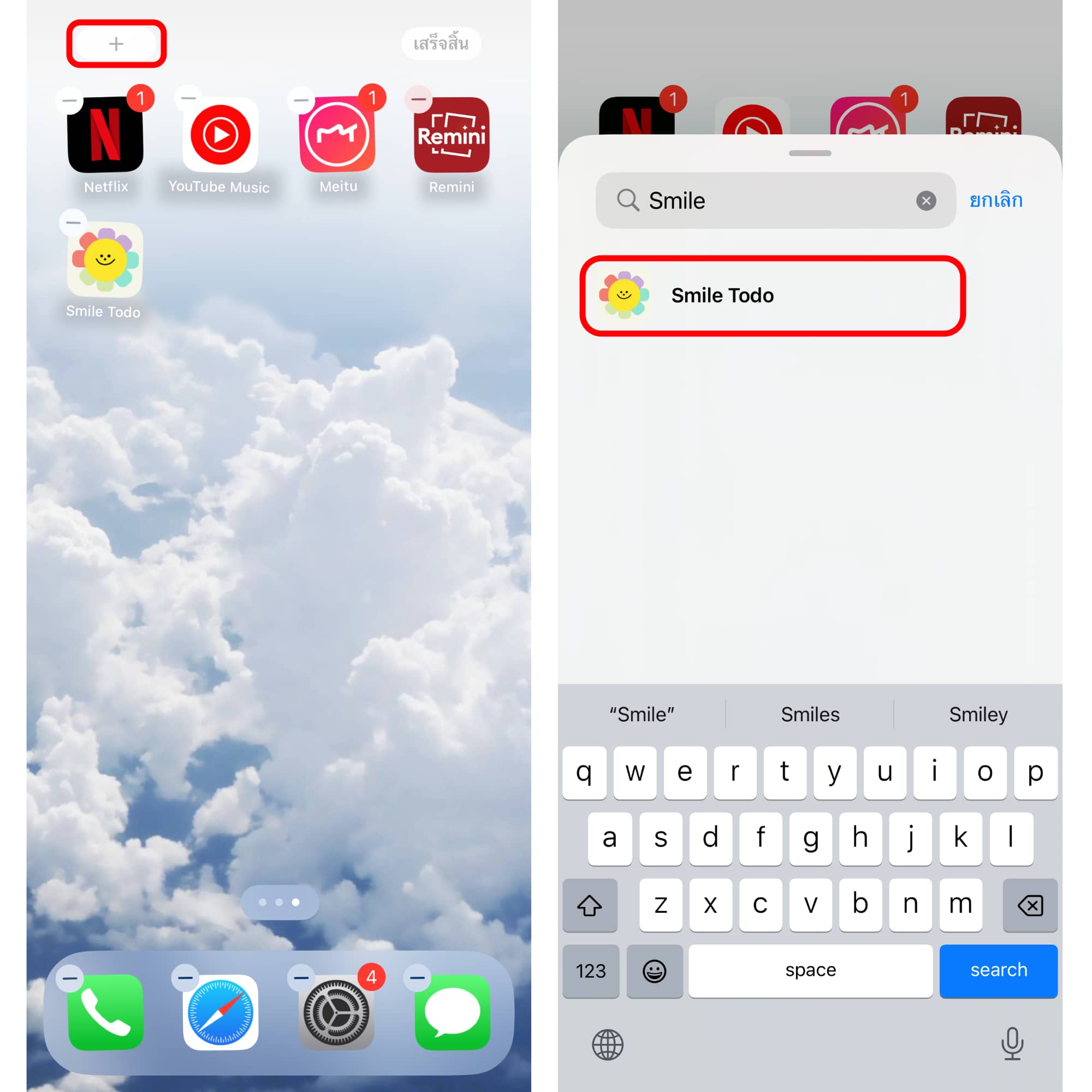 ให้เราไปที่หน้าจอหลักจากนั้น “กดค้างที่หน้าจอ” แล้ว กด + > พิมพ์หาแอป Smile To Do