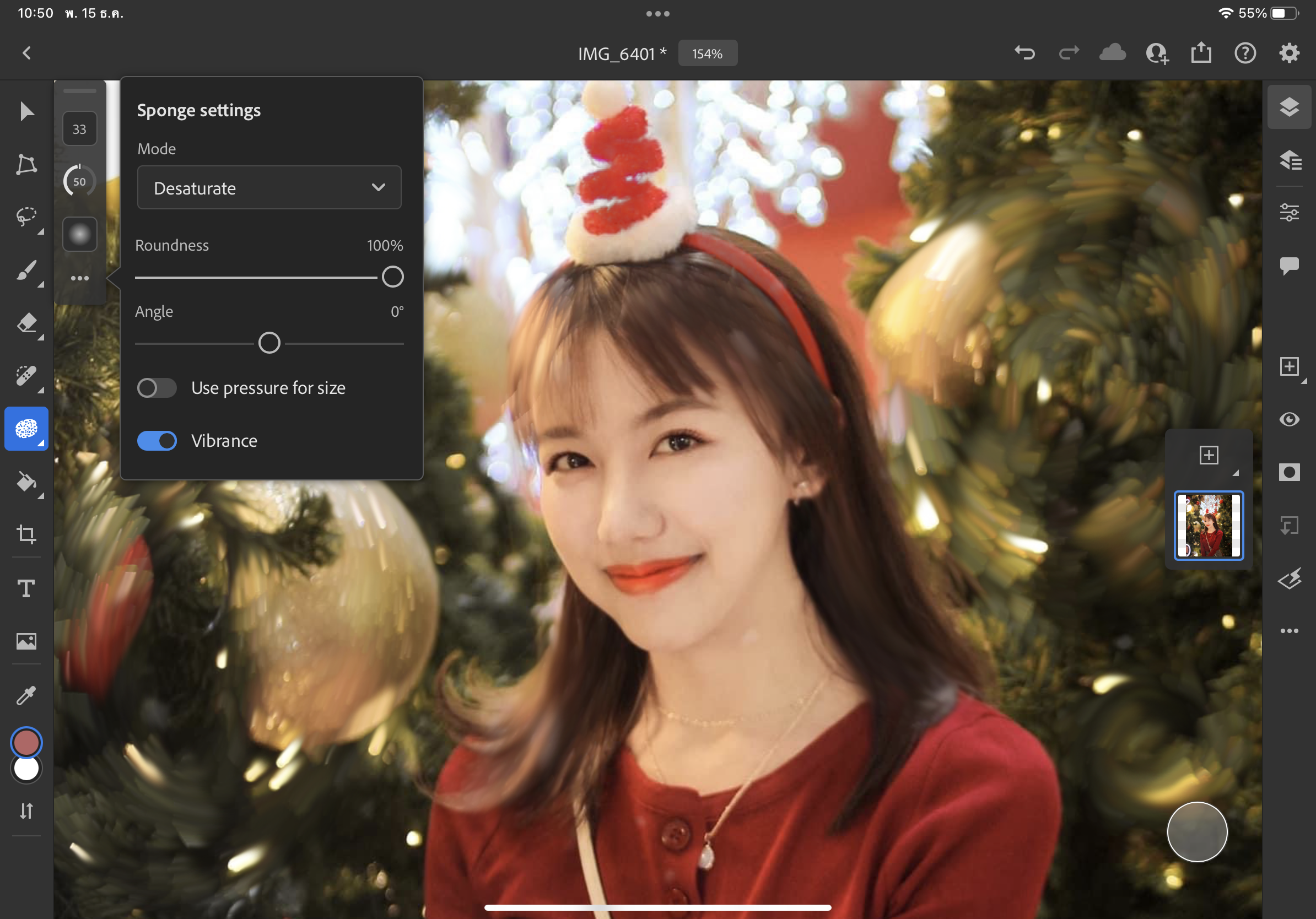 ซึ่งเครื่องมือ Sponge ใน Photoshop สำหรับ iPad สามารถปรับ Flow, Hardness และสามารถปรับตั้งค่าเพิ่มเติมได้ด้วยโดยสามารถเลือก Mode จะมีให้เลือกอยู่สองโหมดคือ Desaturate ที่จะทำให้บริเวณที่เราเลือกมีความอิ่มตัวน้อยลง ส่วน Saturate จะทำให้บริเวณที่เราเลือกมีความอิ่มตัวเพิ่มขึ้น นอกจากนั้นยังสามารถปรับ Roundness และ Angle ได้อีกด้วย