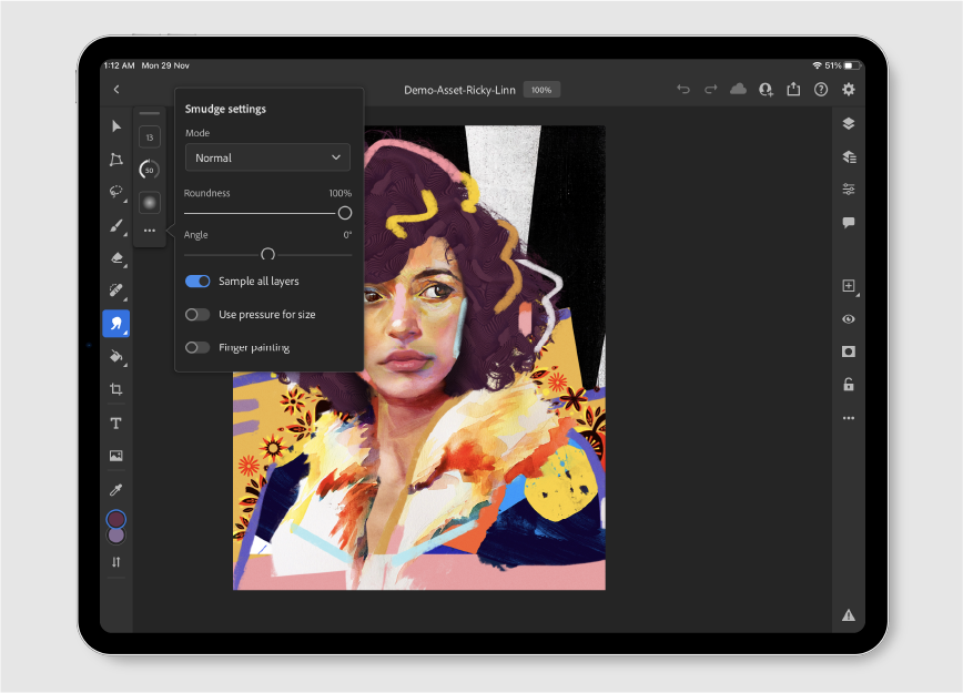 ซึ่งเครื่องมือ Smudge ใน Photoshop สำหรับ iPad สามารถปรับได้บรัชได้ทั้ง Size, Strength และ Hardness และสามารถตั้งค่า Smudge เพิ่มเติมได้ด้วย โดยสามาถเลือก Mode, Roundness, Angle เพื่อปรับตามความเหมาะสมในการใช้งาน
