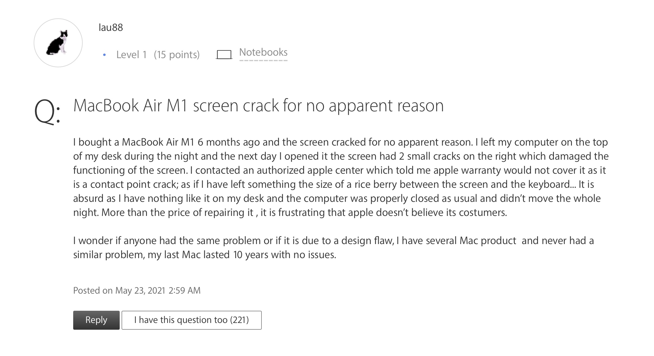 หนึ่งในผู้เจอปัญหาเผยว่า หลังกางจอเพื่อเปิดใช้งานเครื่องก็พบว่าจอแตก และได้ติดต่อ Apple Support ไปกลับพบว่าต้องจ่ายค่าซ่อม ถึงแม้ว่าจอที่แตกนั้นจะแตกเองโดยไม่ได้ตกหรือกระแทกแต่อย่างใด