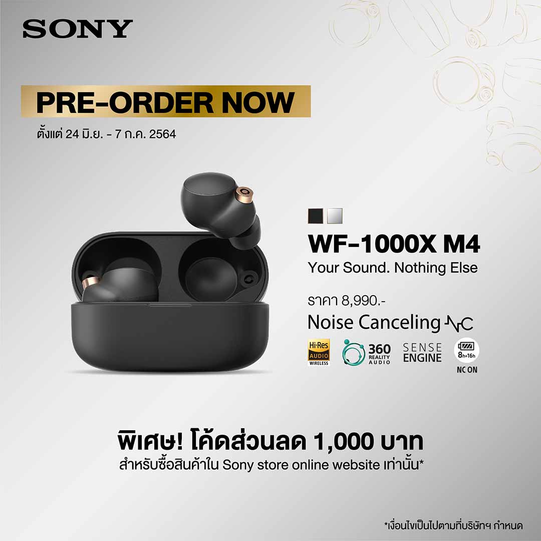 WF-1000XM4 พร้อมเปิดให้ผู้สนใจได้สั่งจองล่วงหน้าตั้งแต่วันที่ 24 มิถุนายน ถึง 7 กรกฏาคม 2564 ในราคา 8,990 บาท