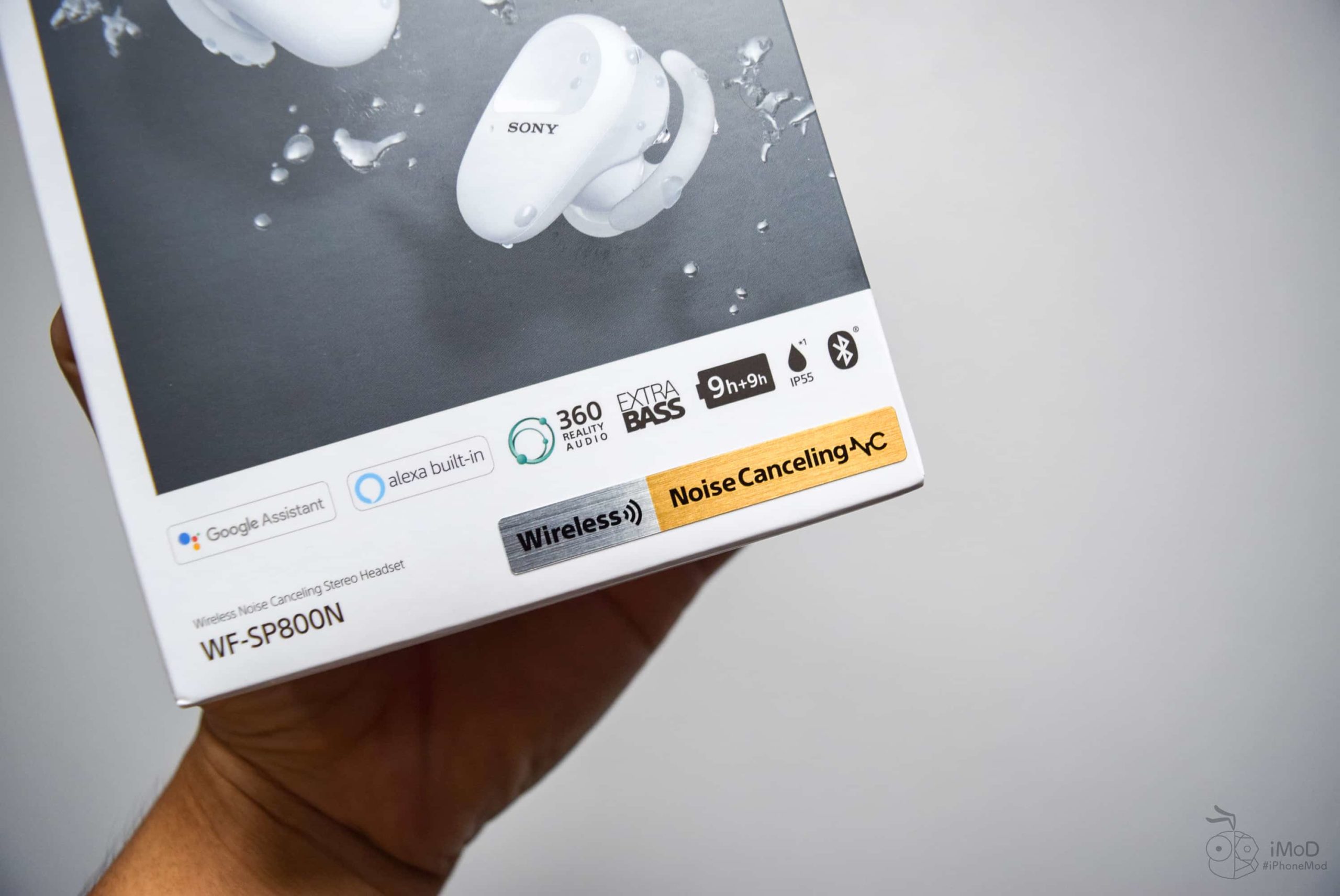 ที่ตัวกล่องของหูฟัง Sony WF-SP800N ระบุสเปคไฮไลท์สำคัญไว้ ดังนี้