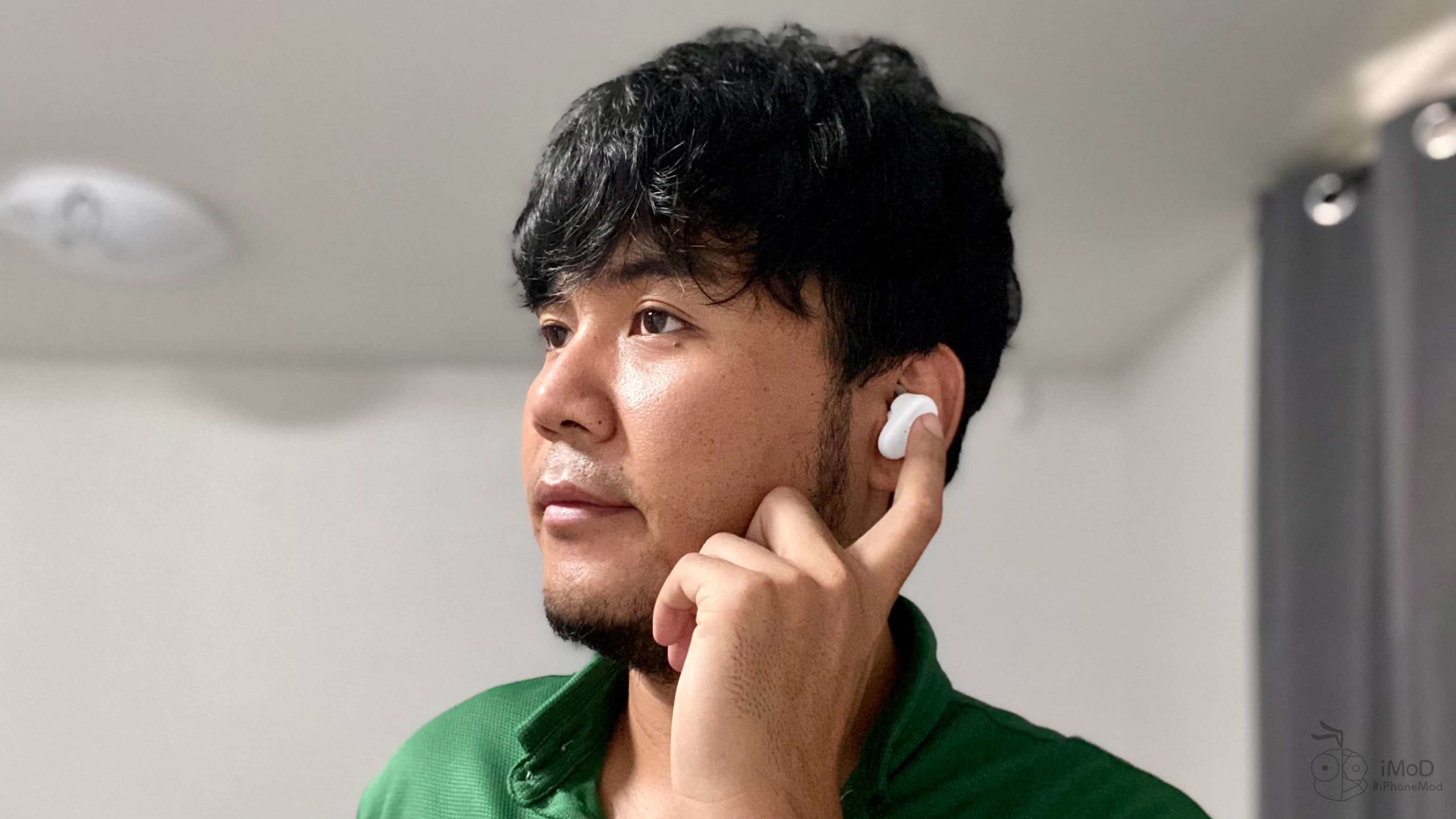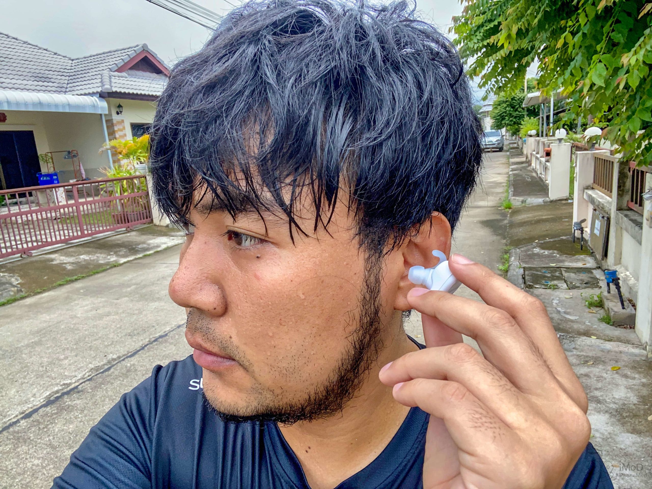 - เราสามารถใช้นิ้วแตะเพื่อควบคุมการทำงานของหูฟังได้เลย เช่น เปิดโหมดตัดเสียงรบกวน รับสาย เป็นต้น และที่เจ๋งคือ เราสามารถแตะเพื่อลดความดังของเสียงเพลงเพื่อฟังเสียงภายนอกได้