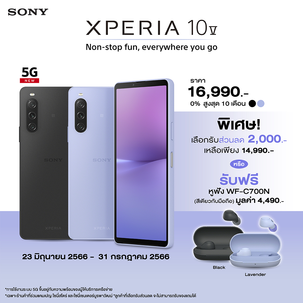2. เลือกรับฟรีหูฟัง Truly Wireless รุ่น WF-C700N (สีดำ หรือสีลาเวนเดอร์)* มูลค่า 4,490 บาท *(เมื่อซื้อสินค้าในราคาเต็ม (16,990 บาท) จะได้รับ หูฟัง WF-C700N สีเดียวกับตัวเครื่อง Xperia 10 V ที่สั่งซื้อ)