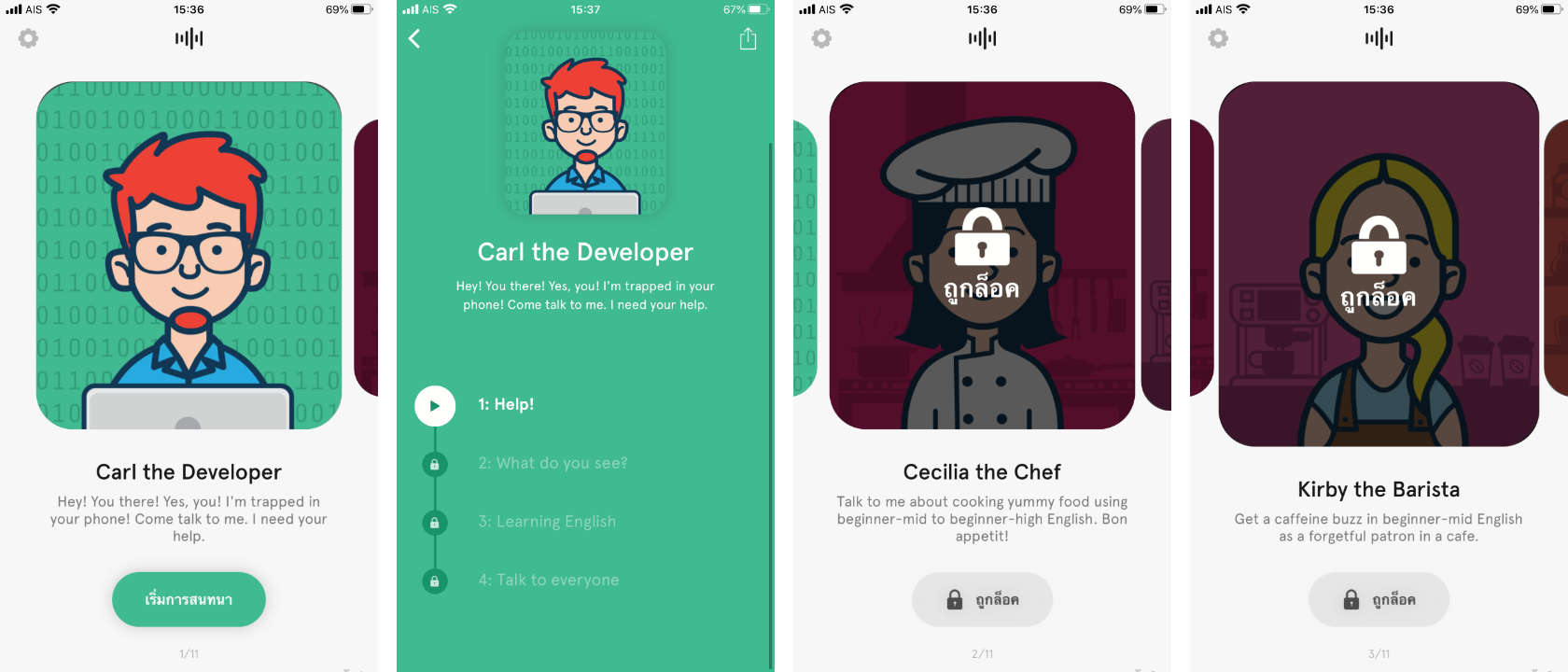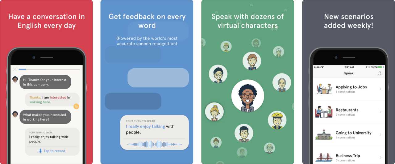 แอปฝึกพูดภาษาอังกฤษและฝึกพูดสำเนียง ด้วยบทสนทนาเสมือนจริงมากกว่า 10 บทกับเจ้าของภาษา ตั้งแต่หัวข้อเรื่องฝึกสัมภาษณ์งาน, การเตรียมสอบ TOEFL, ภาษาอังกฤษธุรกิจ, การท่องเที่ยว, สั่งอาหาร, มหาวิทยาลัย และอีกมากมาย