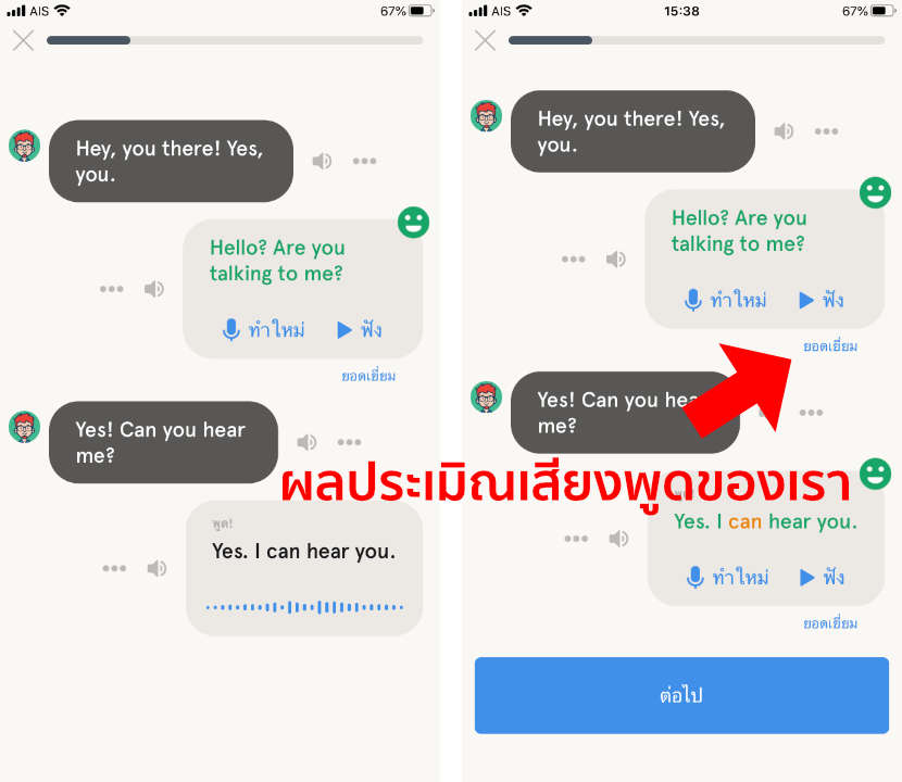 อีกหนึ่งจุดที่น่าสนใจก็คือ สีตัวอักษร ที่หากคุณออกเสียงได้ถูกต้องก็จะเป็นสีเขียว หากออกเสียงได้ใกล้เคียง/พอใช้ก็จะเป็นสีเหลือง หรือหากพูดผิดหรือออกเสียงไม่ถูกต้องเลยก็จะขึ้นเป็นสีแดง ดังรูปด้านล่างนี้