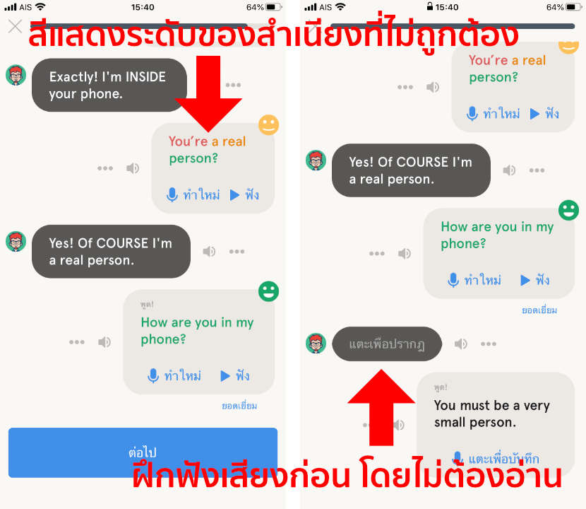 หมายเหตุ: ตัวแอปจะทำการอัปเดตเพิ่มบทสนทนาในทุกสัปดาห์ให้คุณได้เลือกฝึกฝนตามที่สนใจ