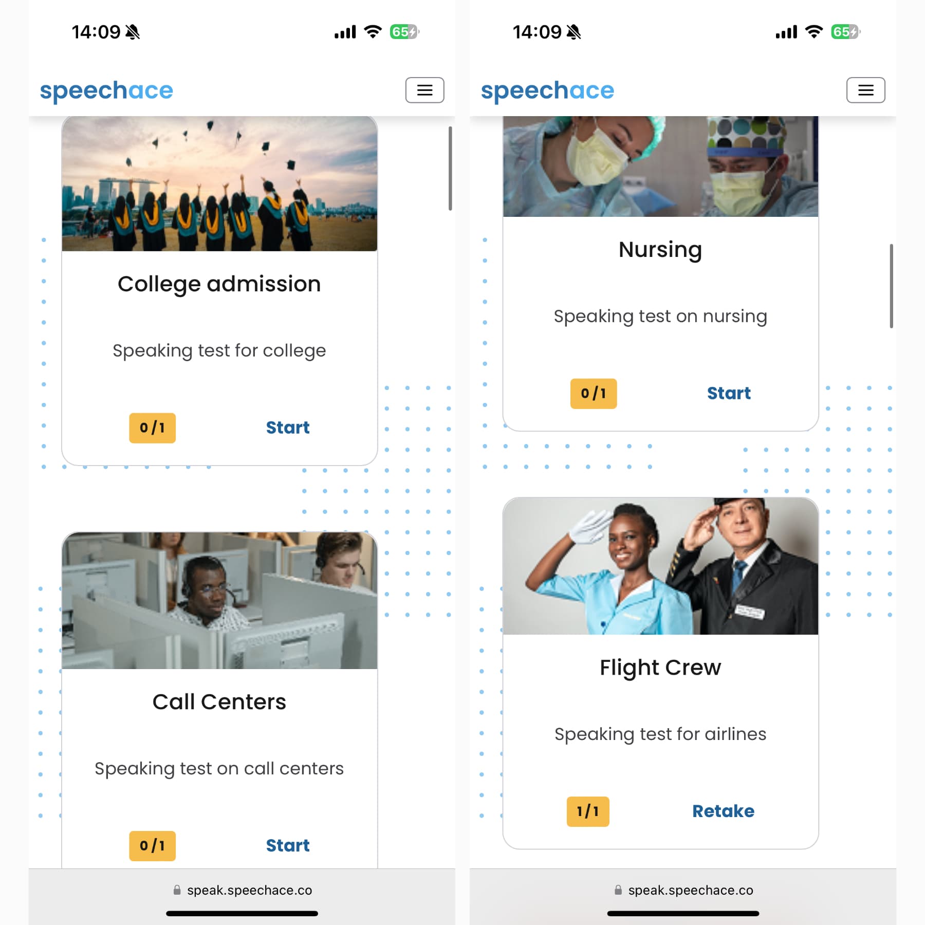Speechace เป็นเว็บไซต์ที่ใช้ AI ในการประเมินทักษะการพูดภาษาอังกฤษ โดยมีแบบทดสอบหลากหลายรูปแบบ ทั้งการพูดตามบทสนทนา การตอบคำถามสัมภาษณ์ หรือการพูดบรรยายในหัวข้อต่าง ๆ นอกจากนี้ยังมีฟีเจอร์ที่น่าสนใจ เช่น การจำลองสถานการณ์สัมภาษณ์งาน และการฝึกพูดในหัวข้อเฉพาะทาง เช่น ด้านการแพทย์ หรือการบริการลูกค้าให้ลองใช้งานกันด้วย