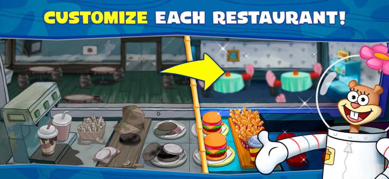 เกมมือถือแนวเข้าครัวทำอาหารตามออเดอร์ของลูกค้าที่มาในธีมของจักรวาลการ์ตูนแอนิเมชันเรื่อง SpongeBob SquarePants ที่คุณจะได้รับบทเป็น “Mr. Krabs” เข้าครัวของ Bikini Bottom ทำเมนูอาหารสารพัด เช่น แพนเค้ก, บาร์บีคิว, กาแฟ, สเต็ก และอื่นๆ อีกมากมาย