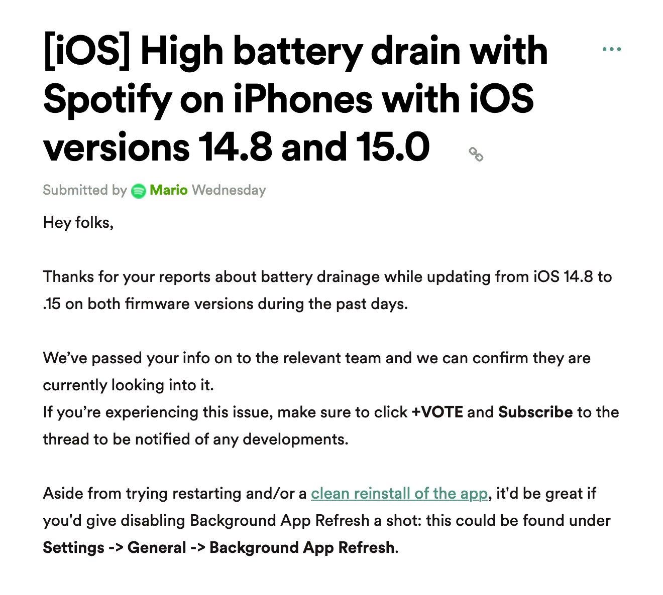 มีผู้ใช้ iOS 14.8, iOS 15 รายงานว่าเมื่อใช้งานแอป Spotify แล้วทำให้ iPhone แบตหมดไว แต่ยังไม่มีข้อมูลว่าผู้ใช้ iOS เวอร์ชันเก่ากว่านั้นเจอปัญหาหรือไม่
