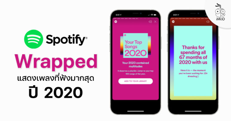 ผู้ใช้ Spotify สามารถเรียกดูเพลงที่ฟังในปี 2020 ได้ในหน้า Home ส่วนของ 2020 Wrapped เราก็จะเห็นเพลงยอดนิยมของเราในปี 2020 ซึ่งภาพที่แสดงบน Stories นี้เราสามารถแชร์ไปยังโซเชียลมีเดียได้