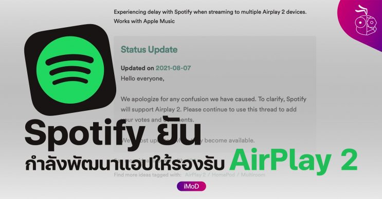 ก่อนหน้านี้มีข่าวว่า Spotify หยุดการพัฒนาแอปให้รองรับ AirPlay 2 แต่ Spotify ยืนยันว่า “กำลังอยู่ในขั้นตอนการพัฒนา” ไม่ได้เลิกทำเหมือนที่รายงาน