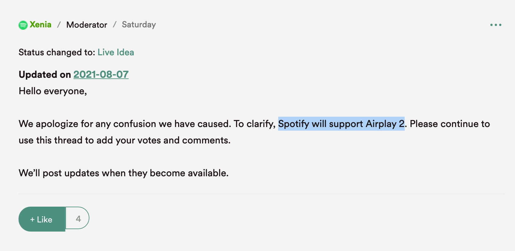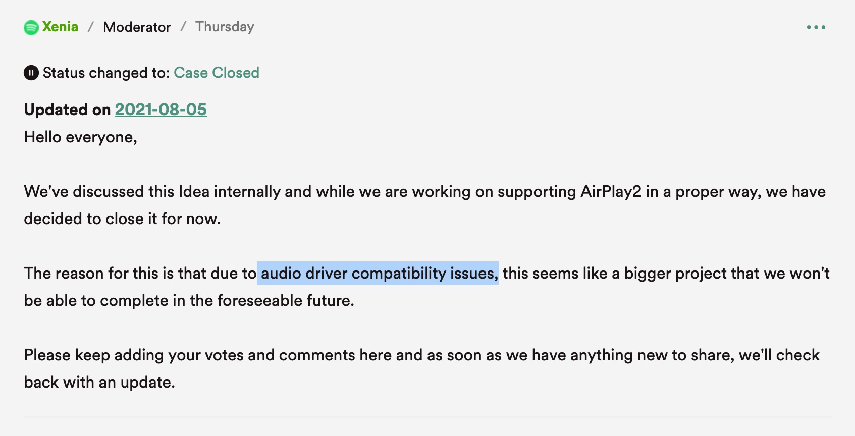 ในหน้ากระทู้เว็บ Spotify ได้มีตัวแทนมาตอบคำถามเรื่องการรองรับ AirPlay 2 ของตัวแอปว่า ในตอนนี้ได้หยุดพัฒนาชั่วคราวจนกว่าจะแก้ปัญหาเรื่องความเข้ากันได้ของเสียง จนทำให้คาดกันว่า Spotify ได้หยุดการพัฒนาการรองรับ AirPlay 2 แล้ว