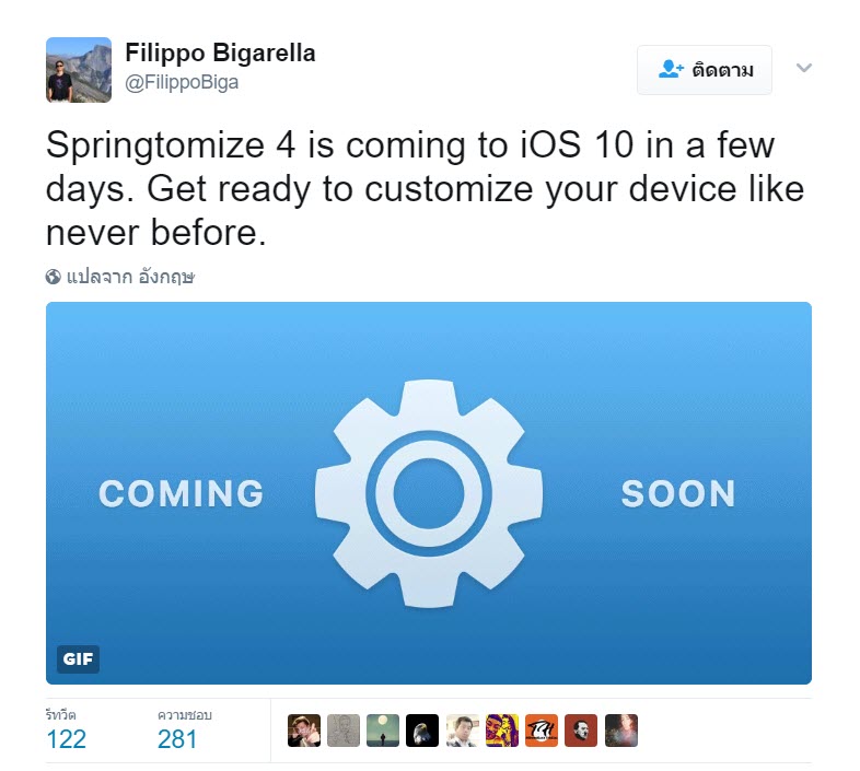 Filippo Bigarella ได้โพสต์อัปเดตผ่าน Twitter เกี่ยวกับความคืบหน้า Tweak สำหรับสาย Jailbreak ชื่อ Springtomize 4 ที่ช่วยให้สามารถปรับแต่ง iOS 10 ว่าจะปล่อยให้ใช้งานเร็วๆนี้ (อีกไม่กี่วัน)