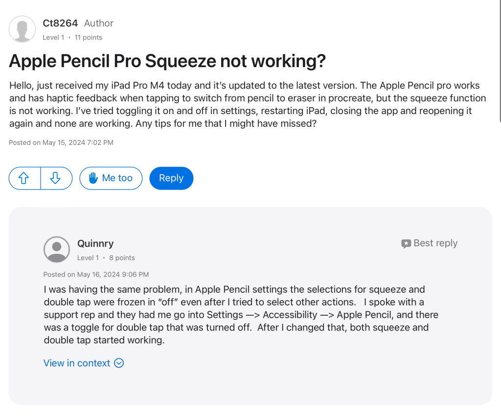 มีผู้ใช้รายหนึ่ง ได้มาโพสต์ใน Apple Community ว่า “ทำไมฟังก์ชันการบีบไม่สามารถใช้งานได้ และได้ลองเปิด ปิด รีสตาร์ท iPad หรือจะปิดแอป และเปิดใหม่อีกครั้งและไม่ได้ผล” และมีผู้ใช้หลายรายออกมาพูดถึง ปัญหานี้เหมือนกัน ซึ่งก็มีคำถามที่ค่อนข้างพบเจออยู่บ่อย ๆ ว่าทำไม Apple Pencil Pro ไม่สามารถใช้งานฟีเจอร์การบีบใน Procreate ได้