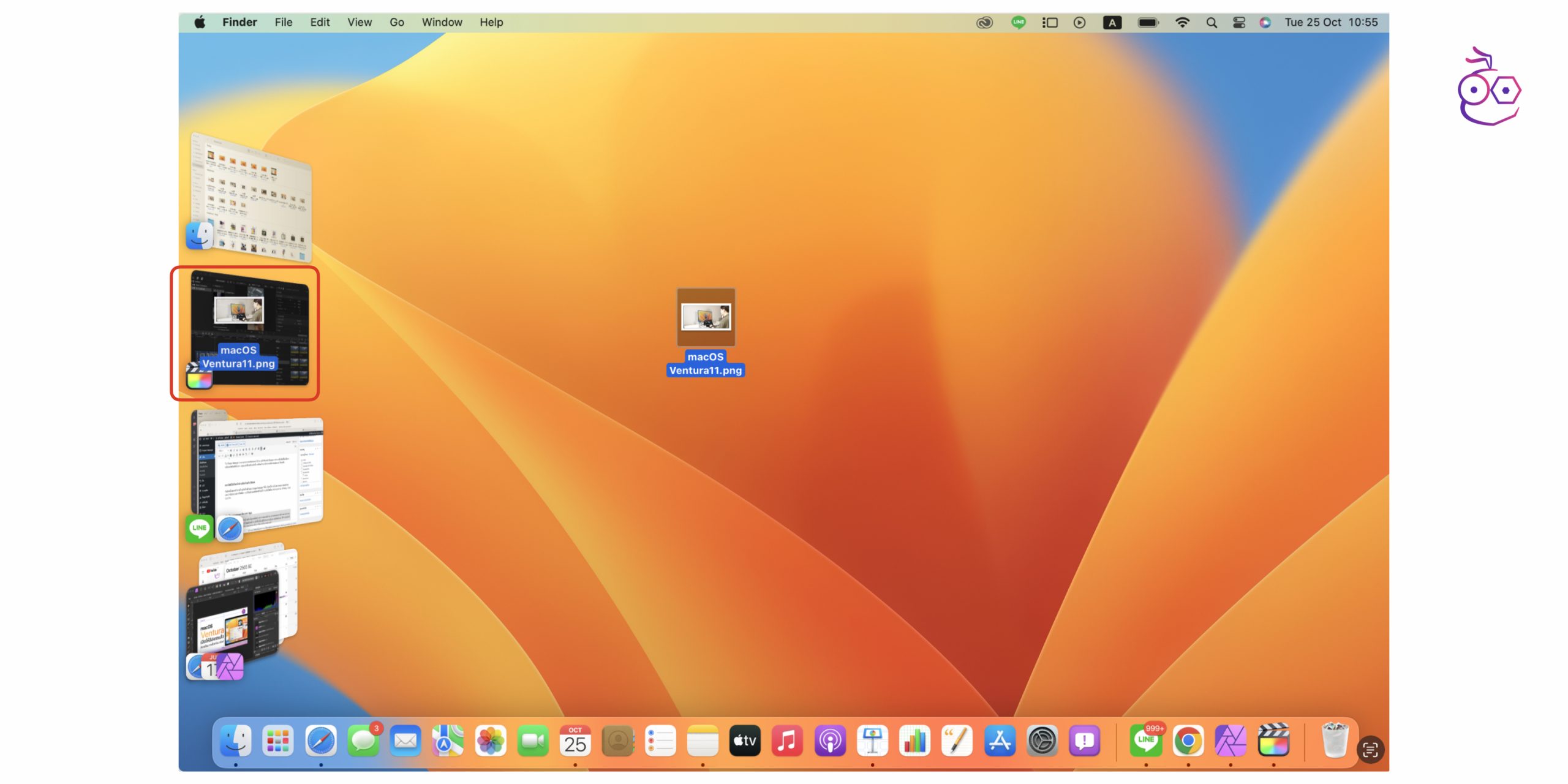 กิมมิคหนึ่งของหน้าต่างด้านเล็กด้านข้างของ Stage Manager ก็คือ เป็นหน้าต่างที่แสดงผลแบบ Realtime และเรายังสามารถลากไฟล์ต่าง ๆ เข้าไปยังแอปพลิเคชันในหน้าต่างเล็กได้ด้วย เช่น Keynote, Affinity, Final  Cut Pro
