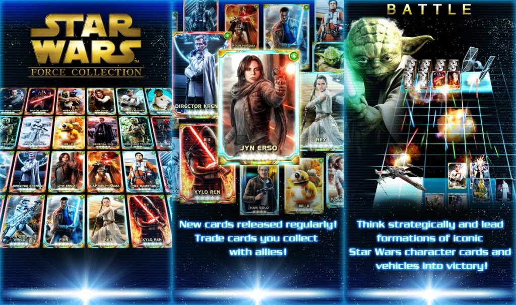 เกมซื้อขายการ์ดต่อสู้กว่า 400 ใบ ที่ขนตัวละครและยานพาหนะจากภาพยนตร์สตาร์วอร์สมาเพียบ รวมทั้ง Darth Vader และ Luke Skywalker รวบรวมตัวอักษรและการ์ดพาหนะจาก Rogue One รวมทั้งกิจกรรมภายในเกม สะสมการ์ด ต่อสู้ และซื้อขายการ์ดเพื่อสะสมการ์ดโปรดให้ได้มากที่สุด (ส่วนตัวคิดว่าเกมนี้ค่อนข้างจะซับซ้อนและเล่นยากพอสมควร ก็สำหรับใครที่ชื่นชอบเกมซื้อขายการ์ดก็สามารถโหลดมาลองเล่นดูได้ครับ)