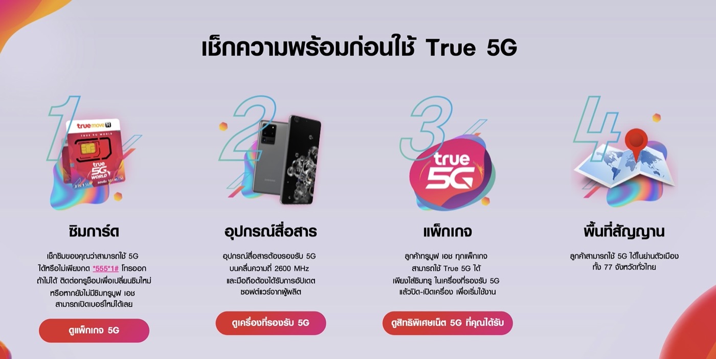 - เปิดใช้บริการ 5G กด *555*2# โทรออก และ อย่าลืมเช็คแพ็กเกจที่ใช้งานอยู่นั้นรองรับ 5G หรือไม่ หากพบปัญหาการเปิดใช้งาน 5G ให้สอบถามเพิ่มเติมที่เบอร์ 1242 หรือ TrueShop ใกล้บ้าน