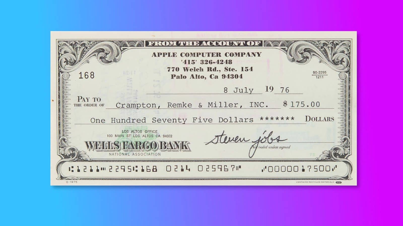 PR Action เผยข้อมูลปิดการประมูลเช็คที่มีลายเซ็นของ Steve Jobs เขียนในนามบริษัท Apple Computer สั่งจ่ายให้กับ Crampton, Remke, & Miller, INC มูลค่า 175 ดอลลาร์ เมื่อปี 1976