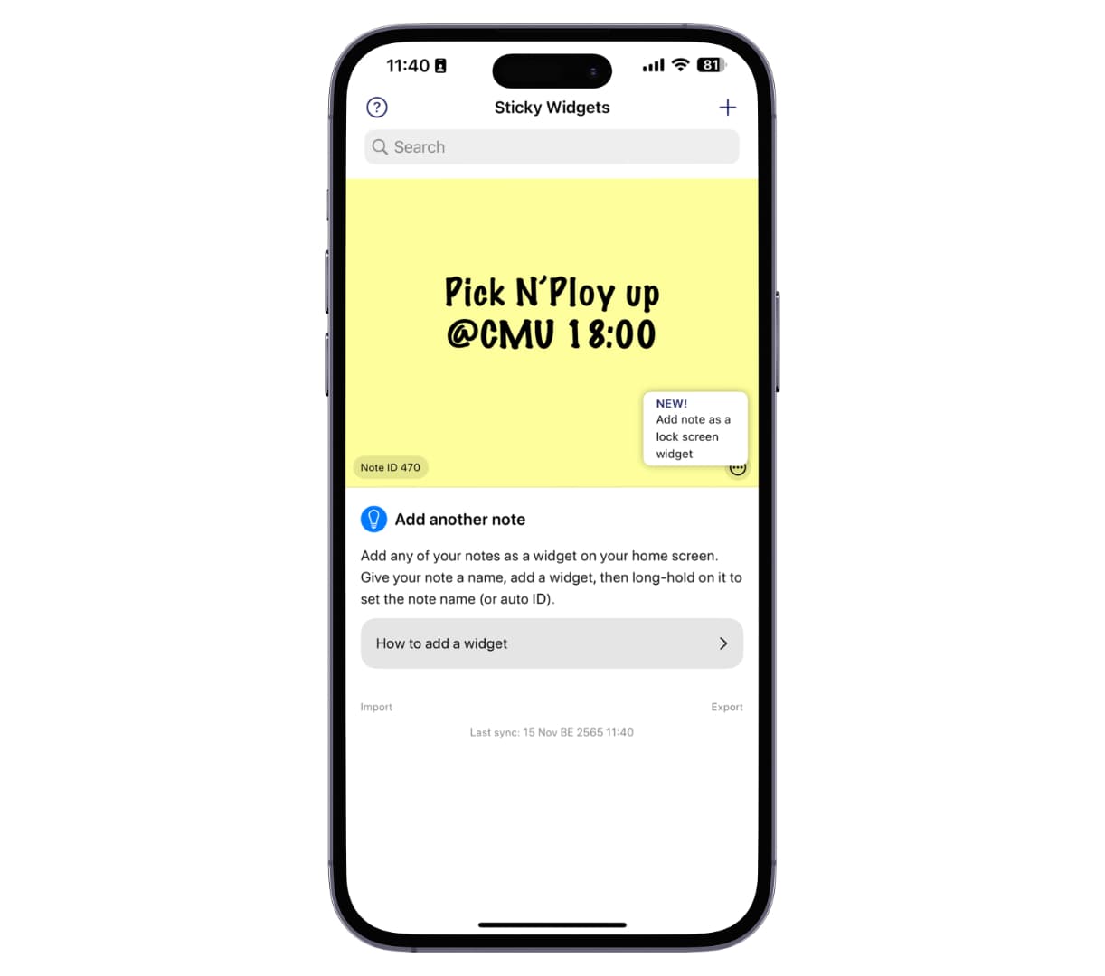 แตะที่ที่หน้าจอโฮมค้างไว้ > แตะเครื่องหมาย + เพื่อเพิ่มวิดเจ็ต จากนั้นให้เลือกใช้งานวิดเจ็ตของแอป Sticky Widgets