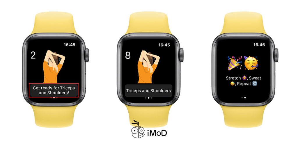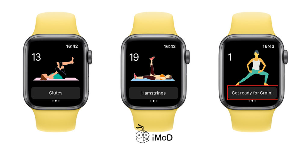 แอปก็จะเริ่มแสดงท่าทางการยืดบน Apple Watch ให้เราทำตามเวลาที่นับถอยหลังในแต่ละท่าได้เลย หากมีการเปลี่ยนท่า แอปก็จะสั่นเตือนที่ข้อมือ แล้วบอกบนหน้าจอว่า Get ready for ชื่อท่าถัดไป เพื่อให้เราเตรียมตัวทำท่าถัดไป โดยไม่จำเป็นต้องดูข้อมือบ่อย ๆ เพียงแค่รอการสั่นเตือนเท่านั้น